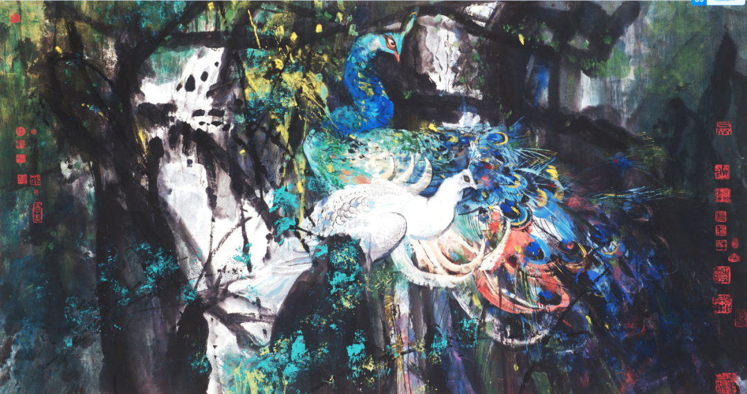 图:石齐作品《人人都在幸福中》70年代的画坛,工笔和写意是主流,但石齐在这幅作品中,却进行了拆开和重新组合的演绎。他解释说:“拆开就是说,工笔的我不会纯工笔,不让人看出来这是工笔的。那么写意,不能说一笔一墨来去有序,我是无序中找有序。”这幅经典作品在当时突破了传统人物画中人物安排的程式,在全国美术界引起了轰动,展览后被中国美术馆收藏。实现了儿时的画家梦想,在画坛也有了一定的影响力,这似乎已经可以称得上功成名就。然而石齐却陷入了迷茫,因为他想要画出自己独特的艺术风格。80年代,随着改革开放的不断深入,中国艺术界和西方现代艺术形式发生了更多的碰撞与融合。为了累积更丰富的艺术养分,石齐愈加深入地钻研中西方的经典艺术。那段时期,石齐在摸索中前行,思考的时间比作画的时间更久。十年时间里,石齐画了八十多张作品。集大写意、工笔、抽象等多种绘画手法于一体的《孔雀图》,就是石齐该时期的代表作之一。