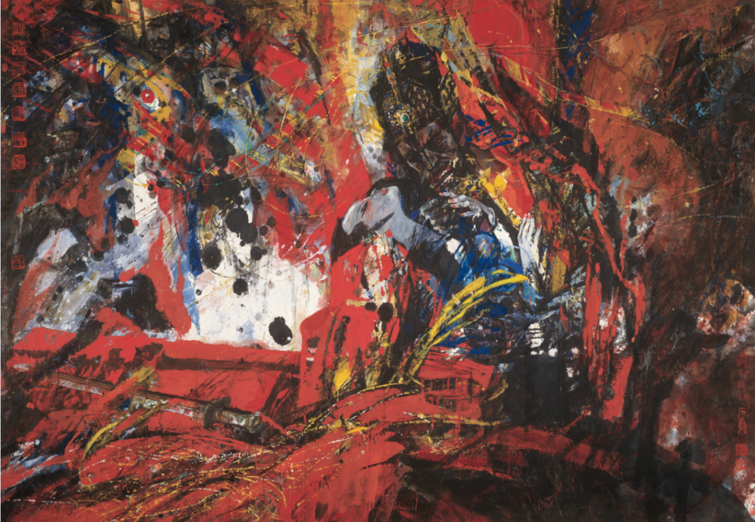 图:石齐作品《霸王别姬》《霸王别姬》就是石齐对自己“三象合一”理念的大胆且成功尝试。根据故事本身情节激昂悲壮的特点,石齐用红黑对比的调子来作画,用色大胆,极具视觉震撼力,充分展现了人物在故事里的激烈冲突与复杂情感。石齐“三象合一”的创新,不仅为他的艺术生涯开辟了新的道路,也展现出中国传统彩墨的新境界。艺术理念一经形成,石齐感到眼前一片澄澈。他发现“三象合一”的思路可以合理地运用到不同的艺术形式中,其中便包括他精通的雕塑。从此,他的创作有了土壤,有了依托。他说:“我觉得雕塑是艺术里头最伟大的一种,因为它是永恒的。我的雕塑四面八方都可以看,各角度不一样。这地方清楚一点,那地方模糊一点,这地方诡异一点,那地方不懂一点,三象合一。”