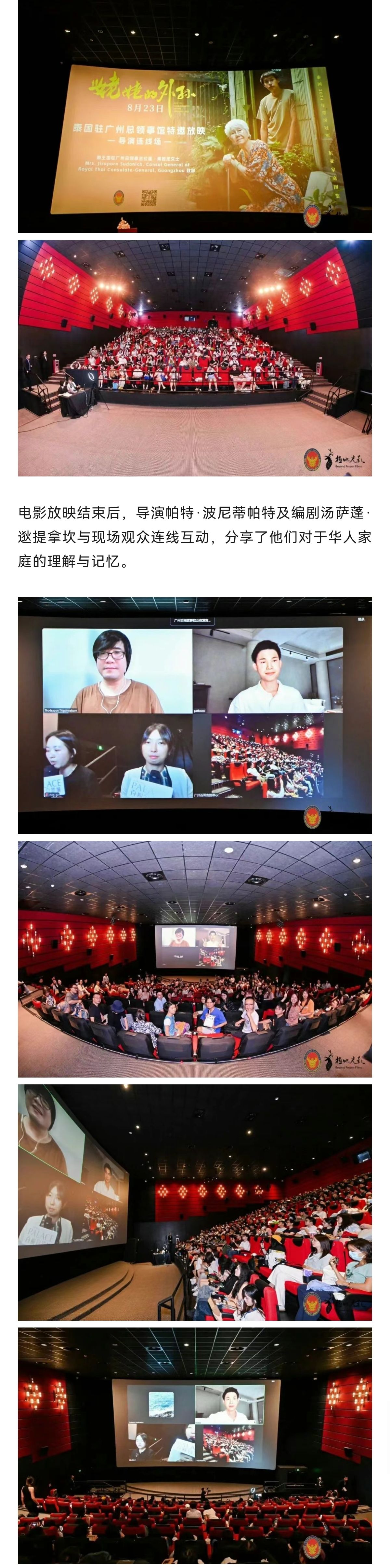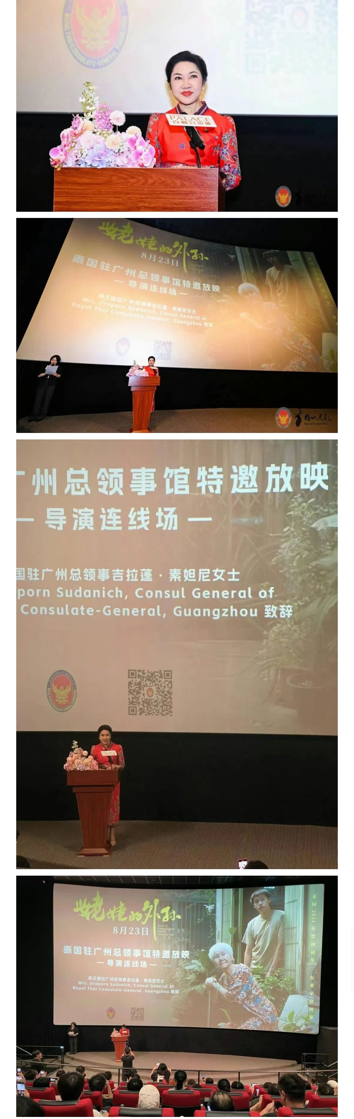 吉拉蓬·素妲尼总领事在致辞中介绍道:“今晚各位将观赏到泰国电影《姥姥的外孙》,该电影也将于今日起全中国上映。总领事馆希望这部电影可以如同以往放映过的电影一样,成为又一部深深打动在粤泰国电影影迷和泰国之友的作品,《姥姥的外孙》不仅有着令观众留下深刻印象的泰式魅力,还讲述了泰国华人家庭的亲情故事。电影当中展现的潮汕元素、语言、文化和生活习惯也许会让在座的不少观众倍感亲切,可见泰中两国的紧密联系由来已久,正如同我们常提到的‘中泰一家亲’。”