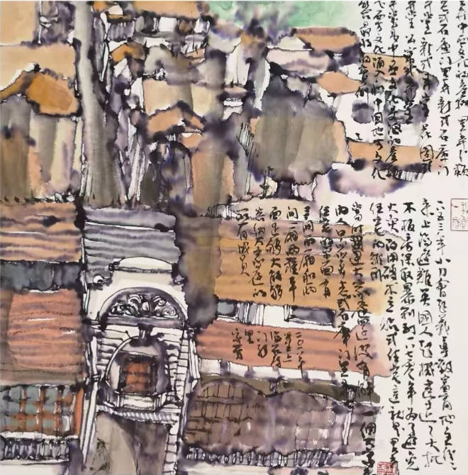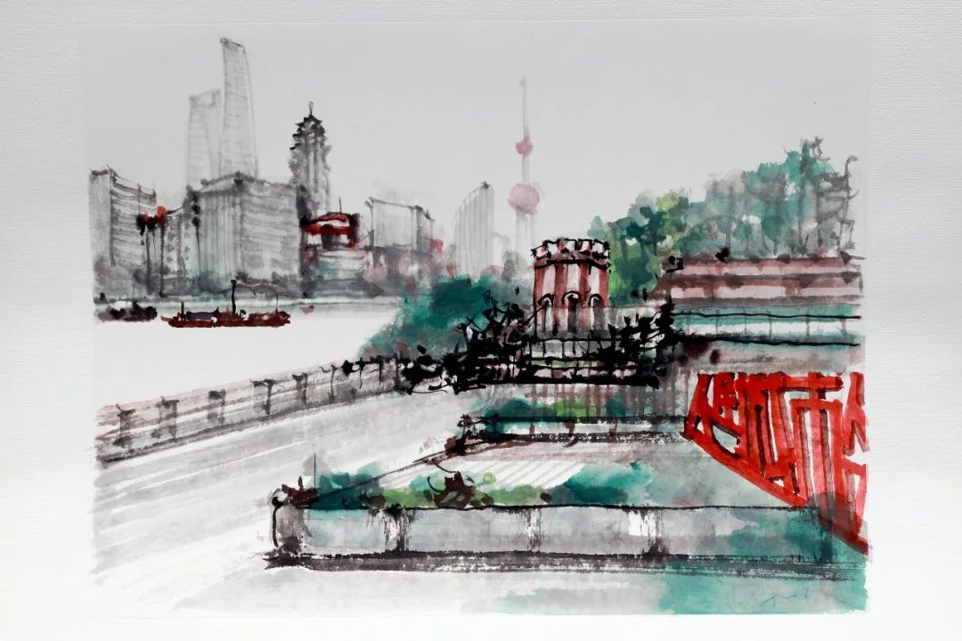 “要运用山水画的创作理念去表现城市,是前所未有的,因为古人没有见过高楼,没有参照体,就没有现成的技法。这么软的一支毛笔,要去画这么挺拔的城市建筑线条,是很难的。但是笔墨当随时代,因为时代的对象变了,你的笔墨也必须要跟着变。这个‘变’就是要丰富你画的创作性。这需要当代的创作者去思考,怎样去借鉴、去迁移、去创新。”
