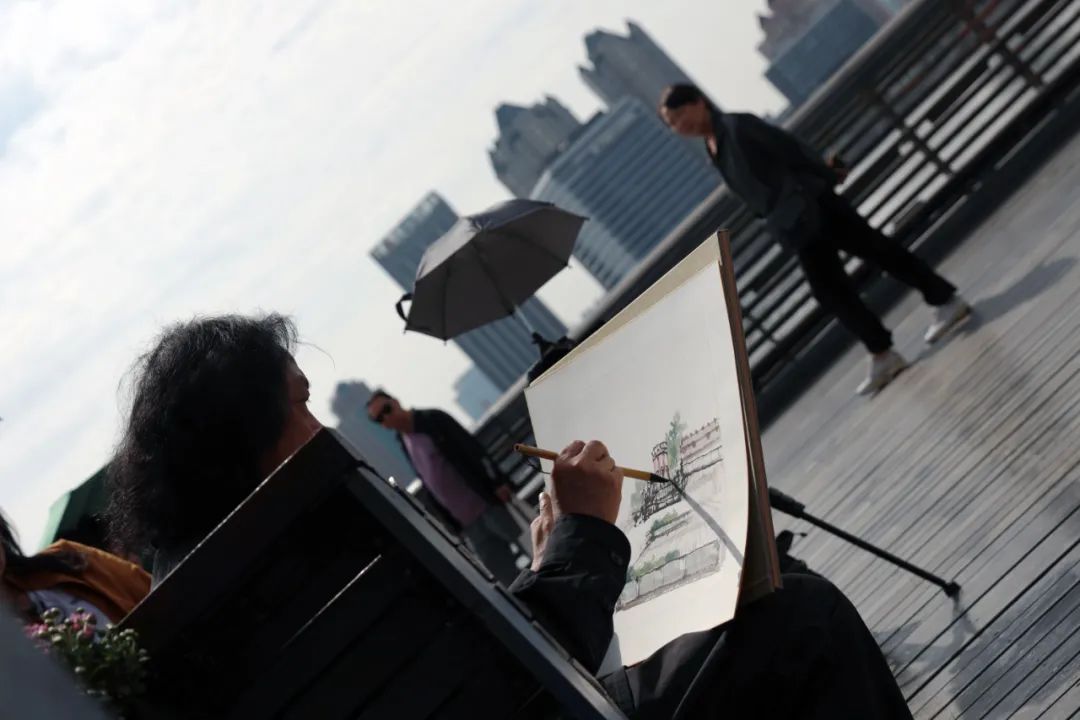 汪家芳说:“来到了杨浦滨江创作和写生,是一件特别有意义的事。我们所看到的‘人民城市人民建,人民城市为人民’这个理念彰显了国家对人民的关爱,也体现了人民对这座城市的热爱。作为生活在这个城市的艺术家,我想用我的画笔把身边的美景讲述出来。”