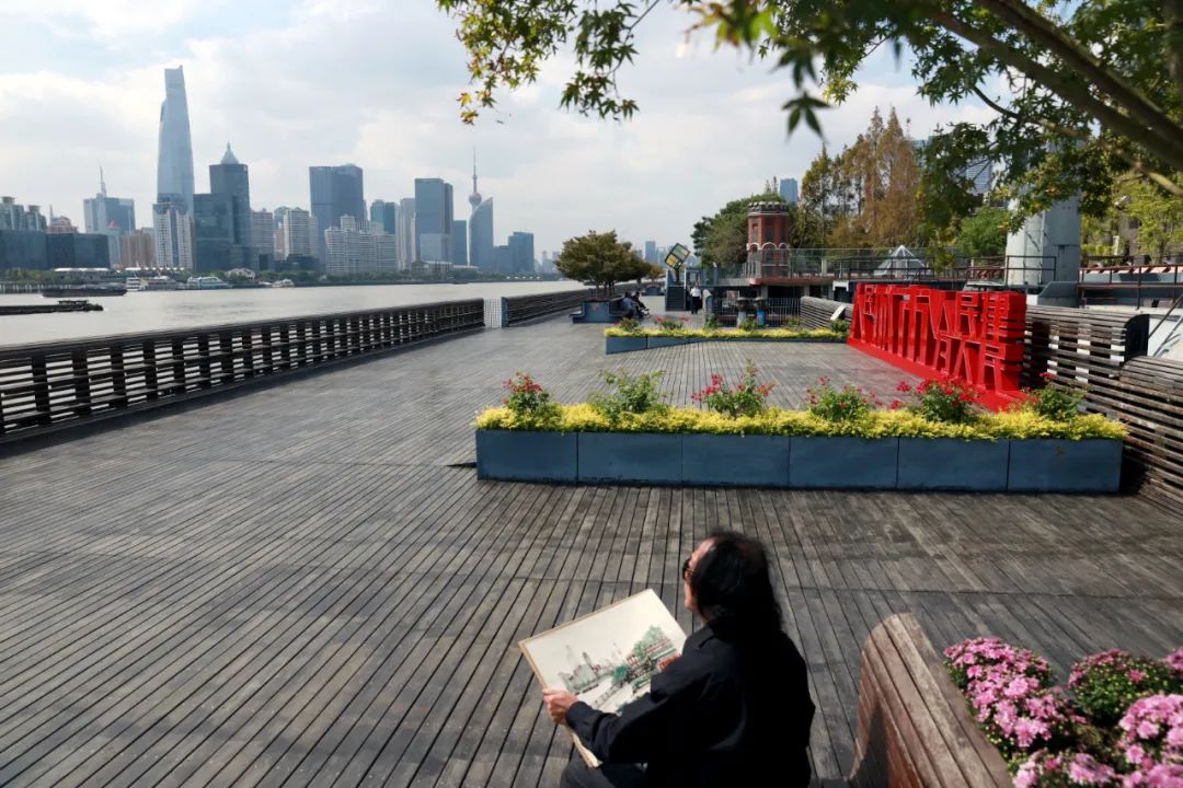 “一栋栋高楼,就像是一座座山峰,错落有致、张弛有度地排布着。”站在杨浦滨江的亲水步道,凭杆眺望浦江天际线,画家汪家芳这样感叹道。