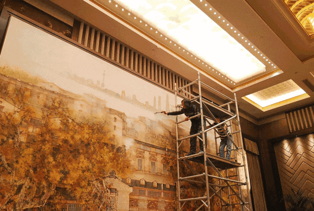 完成造型,汪家芳继续渲染,公共空间的绿意洋溢在浦江两岸,在生机盎然的绿色中,在不同景物的红色点染中,“人民城市”四个红色的字牢牢锁定视线。“‘人民城市’是这幅画的主题,所以它必然是最醒目的。当观众看到你的画,能马上唤起现场感;当他的视线离开了画面,又仍然可以想起你的画。因为艺术要升华,它要把艺术家的一种情感放到创作里。”