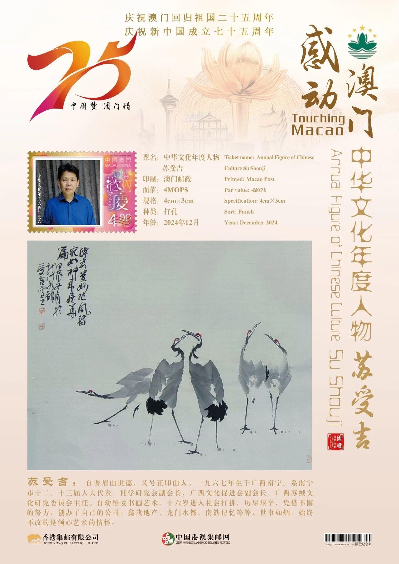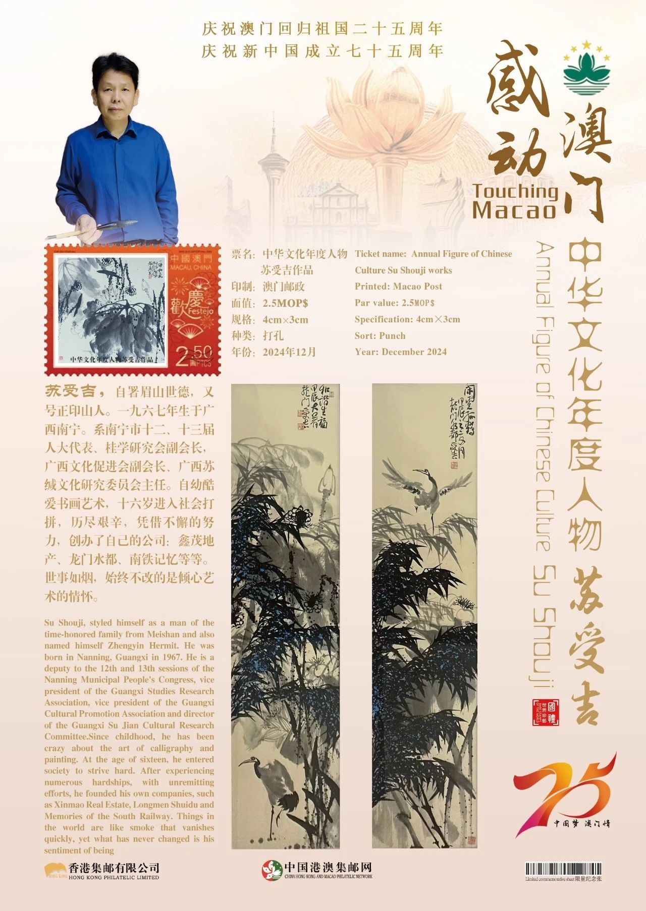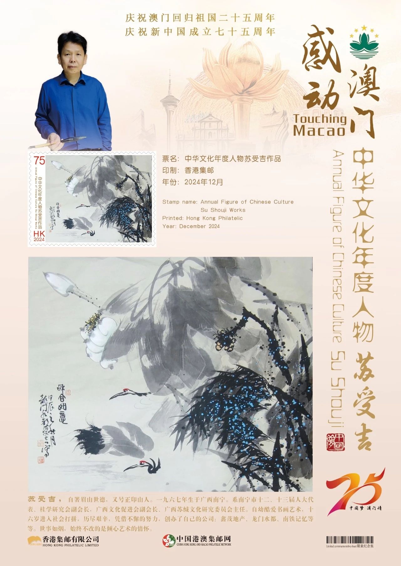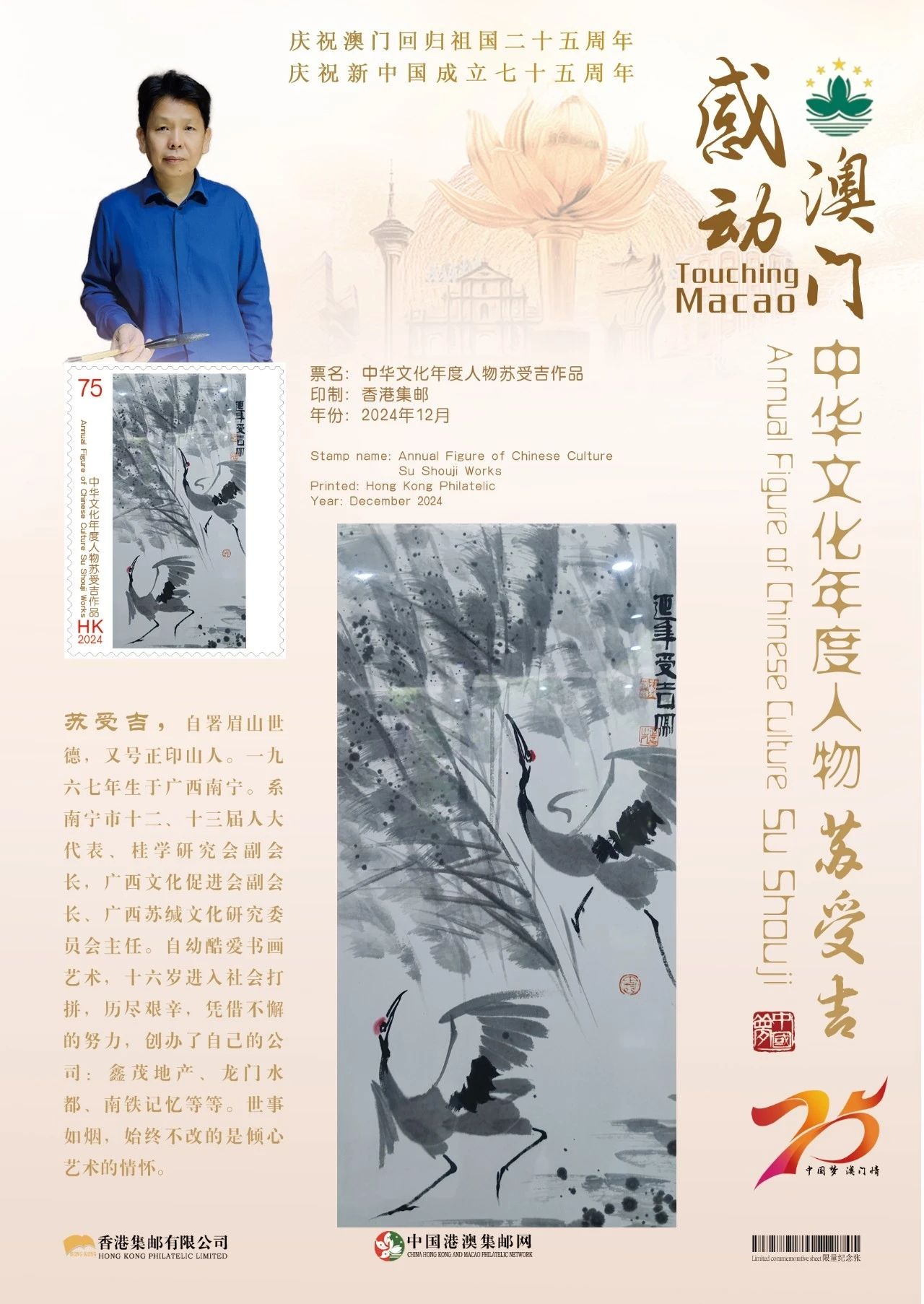 同时,澳门邮政为中国艺术名家苏受吉在全球公开发行一套以“中国梦澳门情”为主题的邮票与珍藏册。这不仅是对艺术家杰出成就的肯定和赞许,更是献给新中国成立七十五周年和澳门回归祖国二十五周年最好的文化贺礼!