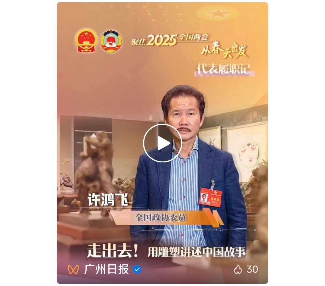 “艺术不应该高高在上,它应该是接地气的、有温度的。”2025年全国两会即将召开,全国政协委员、广东省美术家协会副主席许鸿飞近日在接受记者采访时,用这样一句话概括了他对艺术创作的理解。作为一位全国政协委员和用雕塑讲述中国故事的艺术家,他履职尽责,建言献策,为文艺繁荣发展贡献力量。