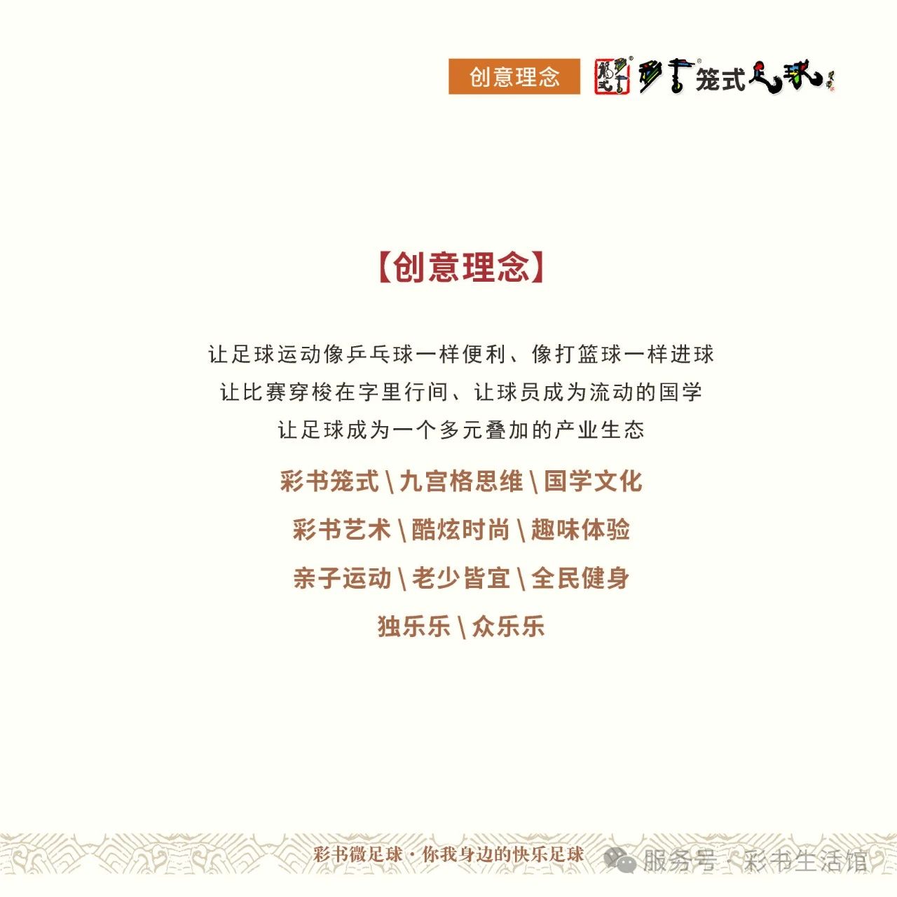 ■以九宫格为创意的人造草皮上,八个形态各异的彩书“乐”字环绕其间,呈现“独乐乐不如众乐乐”的内涵,与围网挡板上的彩书诗词、典故,构建起“德育、美育、体育”三育并举的沉浸式足球空间。■彩书微足球项目创始人何柏俊透露,“乐超”彩书三人足球通过标准化场地、趣味性赛制和彩书国学创新,致力于打造“你我身边的快乐足球”,构建全民运动的微足球生态。