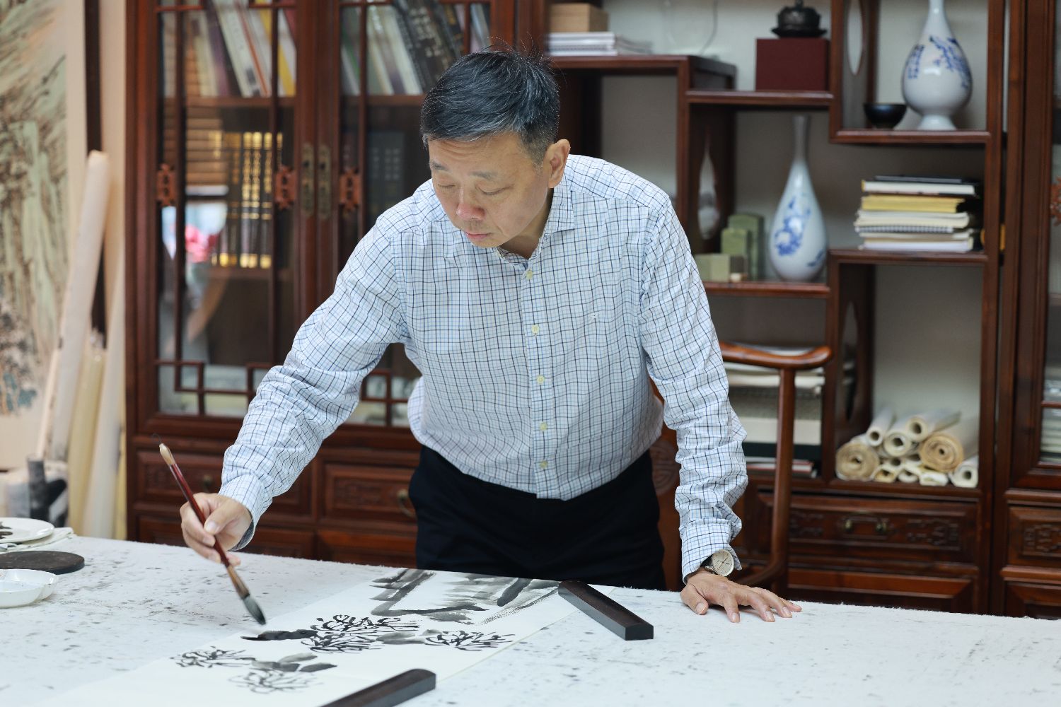 推开黄振宇工作室的木门,初夏的雨气裹挟着宣纸的檀香扑面而来。案头未干的墨迹在宣纸上洇出深浅不一的烟灰色,恰似窗外运河上漫漶的雾霭。这位以"江南新水墨"频频在国外亮相的画家,正在将记忆中的黛瓦白墙与异国的樱花富士,酿成宣纸上流动的时光。