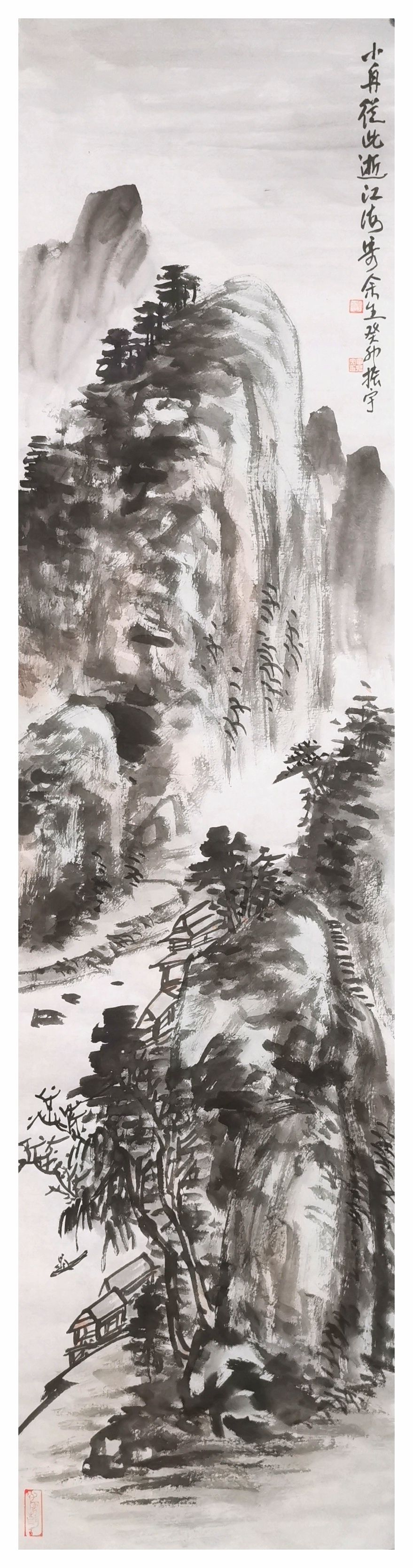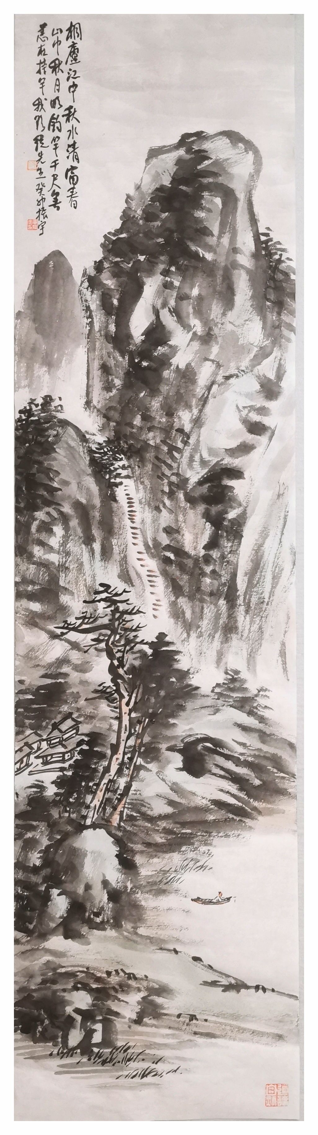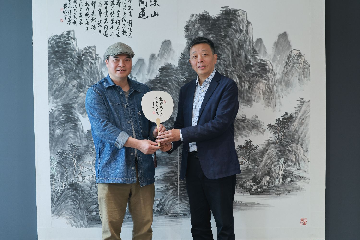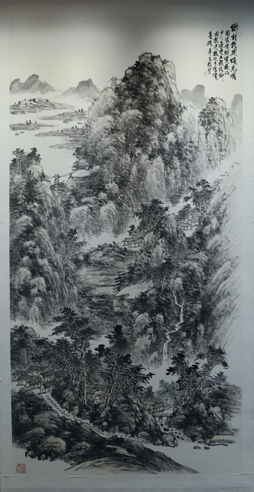 工作室的墙壁上,一幅丈二匹的《乡村振兴颂光明》在微风中轻轻颤动。黄振宇以枯笔皴擦出石桥的斑驳,却用青绿泼彩点染出柳梢的新芽。听他介绍到日本展时的情景:这种将传统小写意与当代构成美学融合的技法,日本富士市美术馆馆长佐藤健一郎初见时颇为惊叹。这批画作2019年在富士山麓展出时,突然想起前几年在日本富士市交流看到的场景——东方夕阳正透过彩绘玻璃,将南湖古船图案投射在他的水墨册页上。