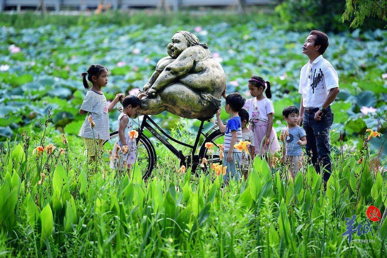 许鸿飞(右一)与他的“肥女”雕塑和孩子们在一起。羊城晚报资·羊城派料图