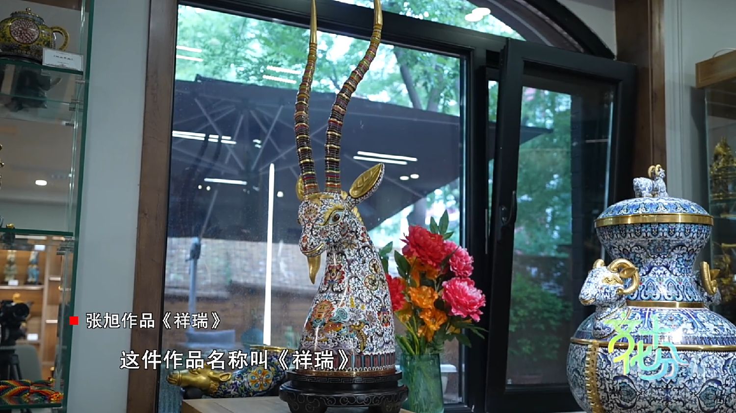 张旭:这件作品名称叫《祥瑞》,我在创作上也很多的时候会考虑用现代这种雕塑艺术体现景泰蓝的造型。其实藏羚羊的羚羊角很短,我在创作时候做成了一个夸张的处理,让它有一个向上伸展,积极向上、健康茁壮成长的寓意。