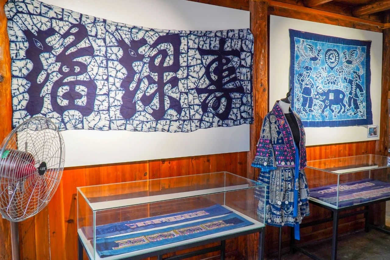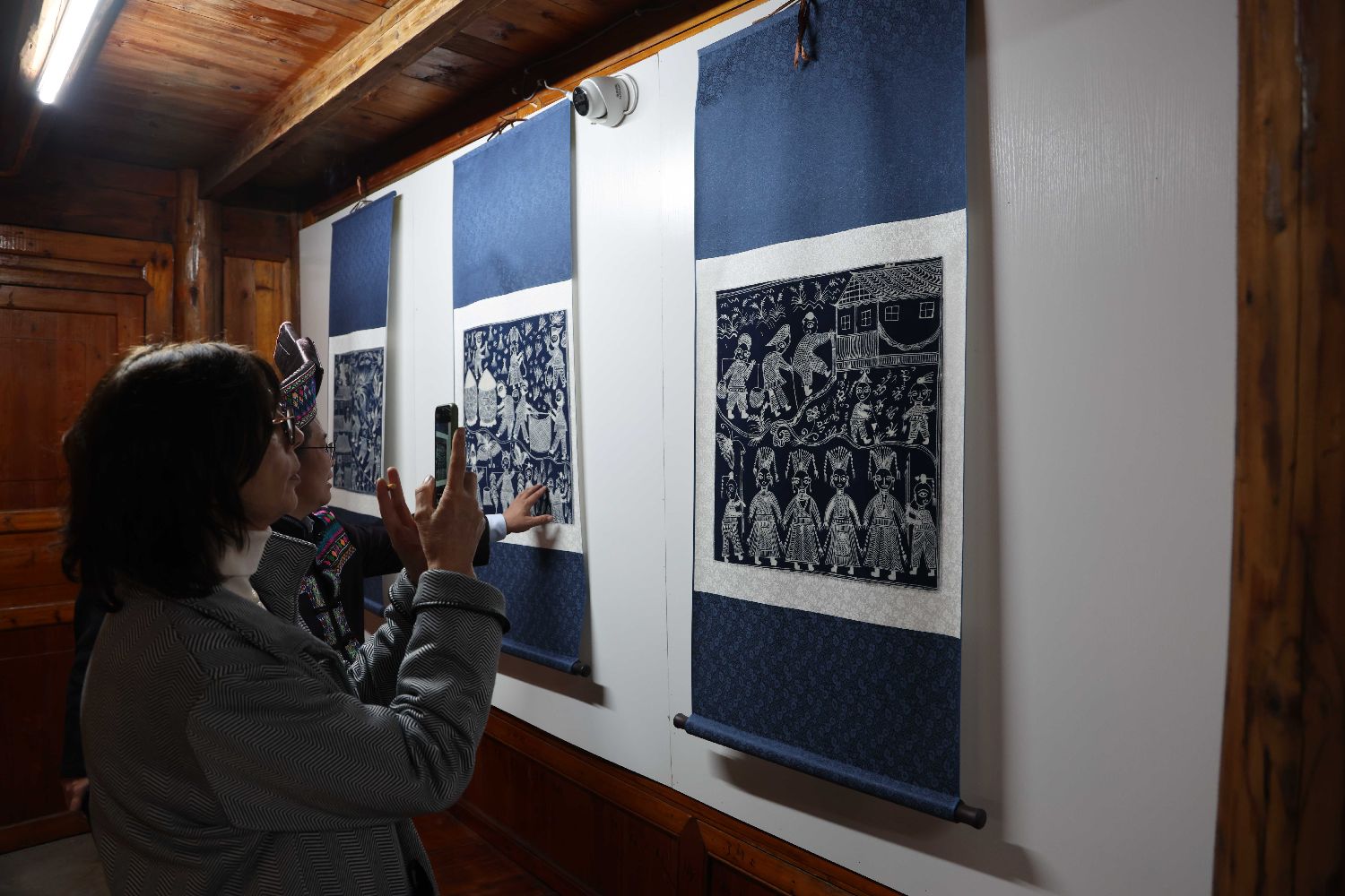 走进艺术中心,蓝白相间的扎染作品静静悬挂,宛如山川与流水在布面上凝固。这里没有被“展陈化”的距离感,扎染不是橱窗里的标本,而是仍在呼吸的生活技艺。苗族艺人马践教授现场展示扎结、浸染、晾晒的全过程,一根线、一盆靛蓝,便构成了世代相传的审美秩序。