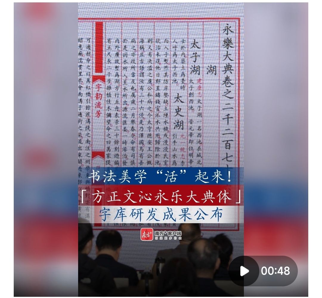 (书法美学“活”起来!“方正文沁永乐大典体”字库研发成果公布,时长共48秒)
