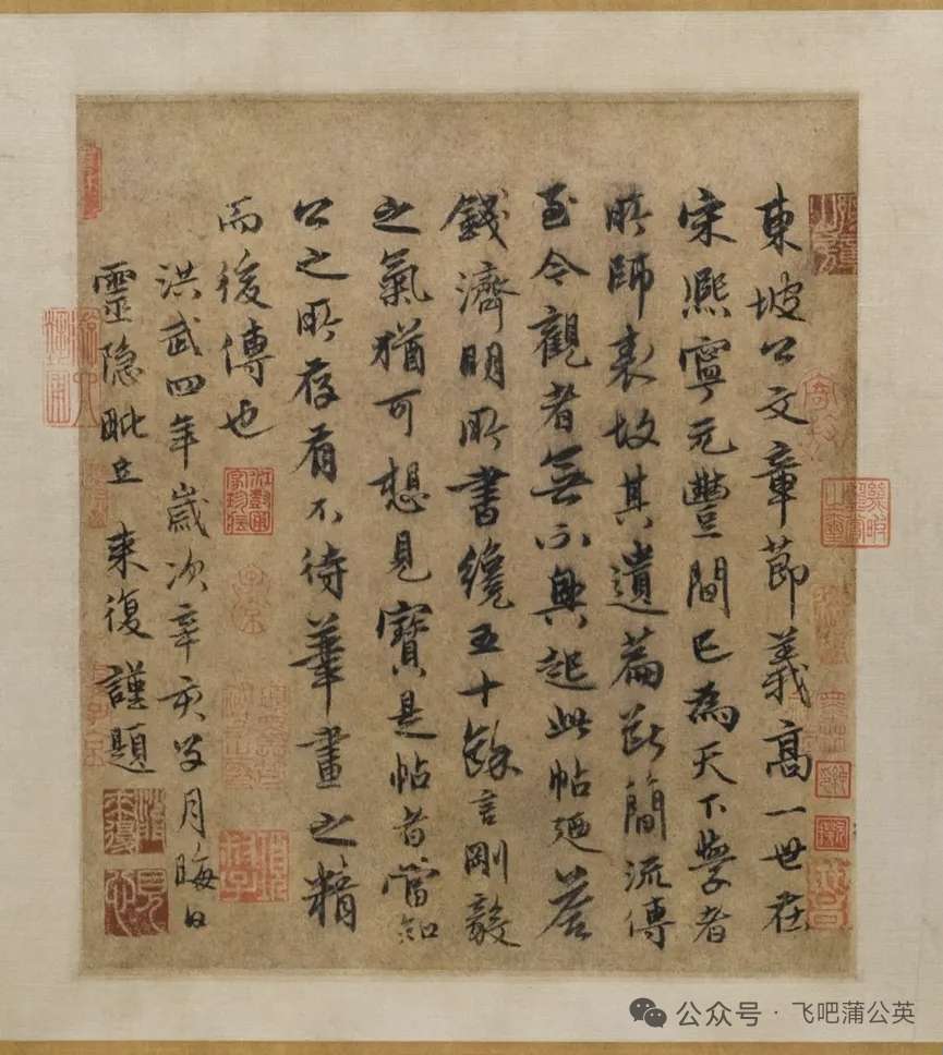 阳羡为今江苏宜兴,早在熙宁四年(1071 年)苏轼于杭州通判任上,就喜其地山水清秀,有买田归老之意。《菩萨蛮》词中即有“买田阳羡吾将老,从来只为溪山好”之句。后苏轼被贬黄州(今湖北黄冈),神宗元丰八年(1085 年)受召还朝,路过阳羡,遂着意经营田产,为归老之计。此帖即是苏轼此年在阳羡与友人商议购买田产事宜的信札。《阳羡帖》后纸有元明之际僧人来复、晚明董其昌二人题跋,以及明代大鉴藏家项元汴题记,乾隆年间进入清内府后,清高宗弘历又于卷前作诗跋,贮藏于乾清宫,编入乾隆五十八年(1793 年)成书的《石渠宝笈续编》。除了这些题跋外,还钤有元、明以来收藏印章六十余方。以上信息来源故宫博物院官网https://www.dpm.org.cn/explode/others/369499.html旅博的收藏很展出的只有苏轼原帖和来复题跋结语苏东坡作为一个大文豪、书法家等给我们留下很多珍贵作品,可是最弥足珍贵的是他面对困境的那一份洒脱。这份洒脱反映在他的文学作品和书法上,给千年以后的我们带来了很多的慰籍。站在东坡真迹前感慨万分。唉,今天开始降温,希望撤展之前,我还可以多去几次。