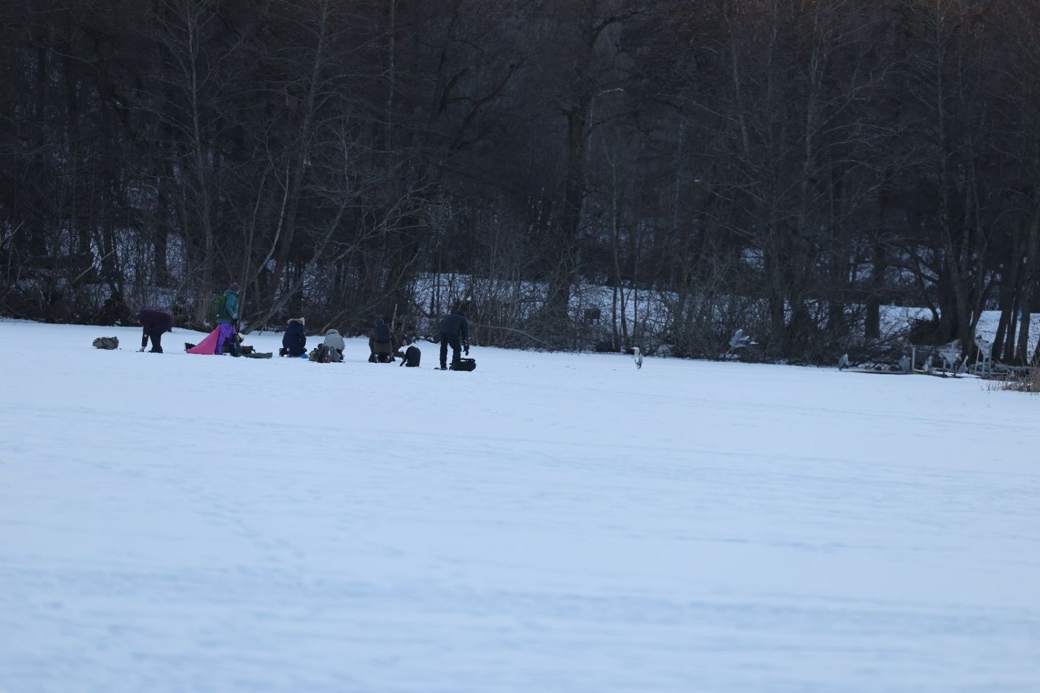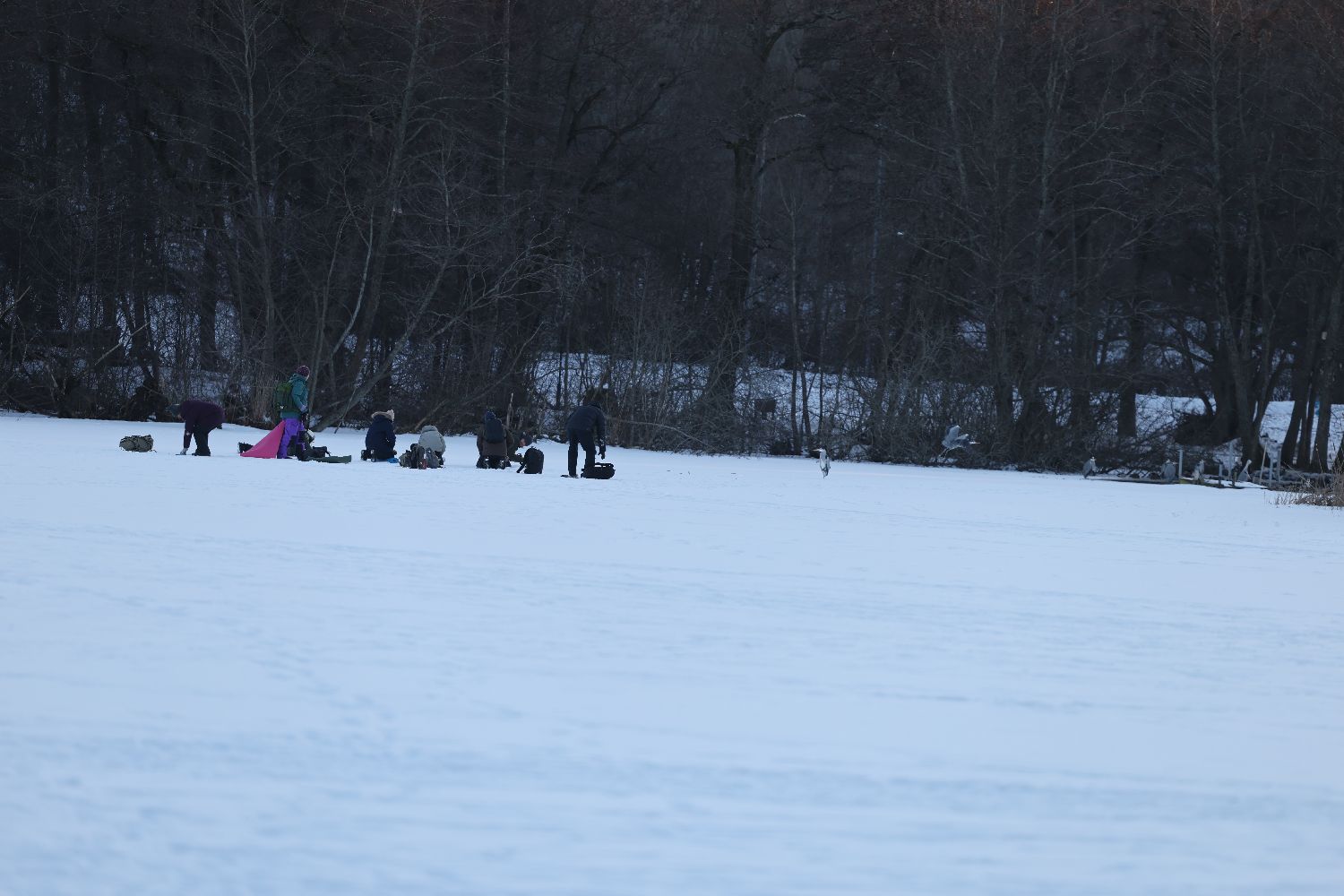 Some kneel.Some lie flat.Tripods rise quietly.Long lenses aim toward the herons in the center of the lake.Camera bags scatter across the snow.Lens caps,gloves,thermos bottles lie casually nearby.