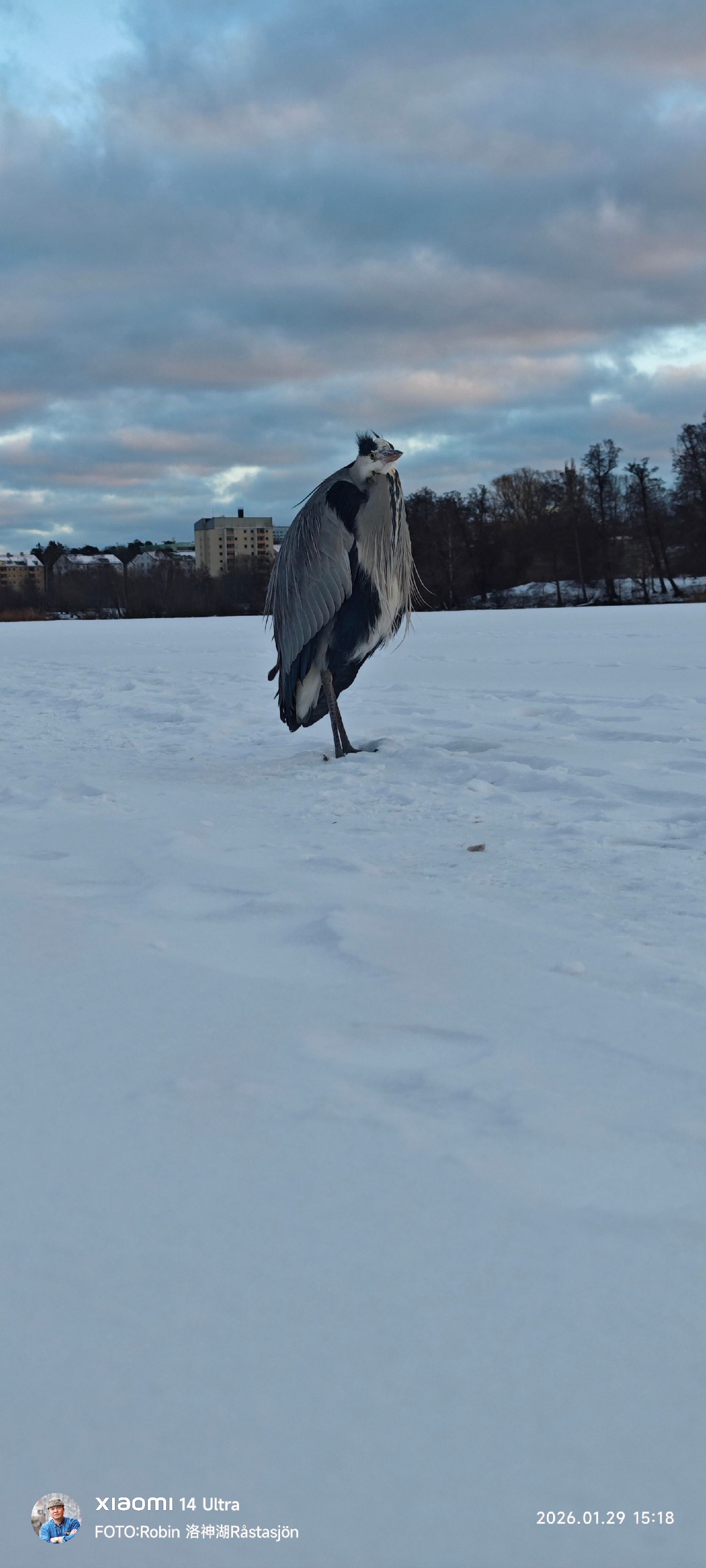 冰湖像舞台。摄影师像观众。苍鹭是唯一不知道自己正在被消费的演员。
