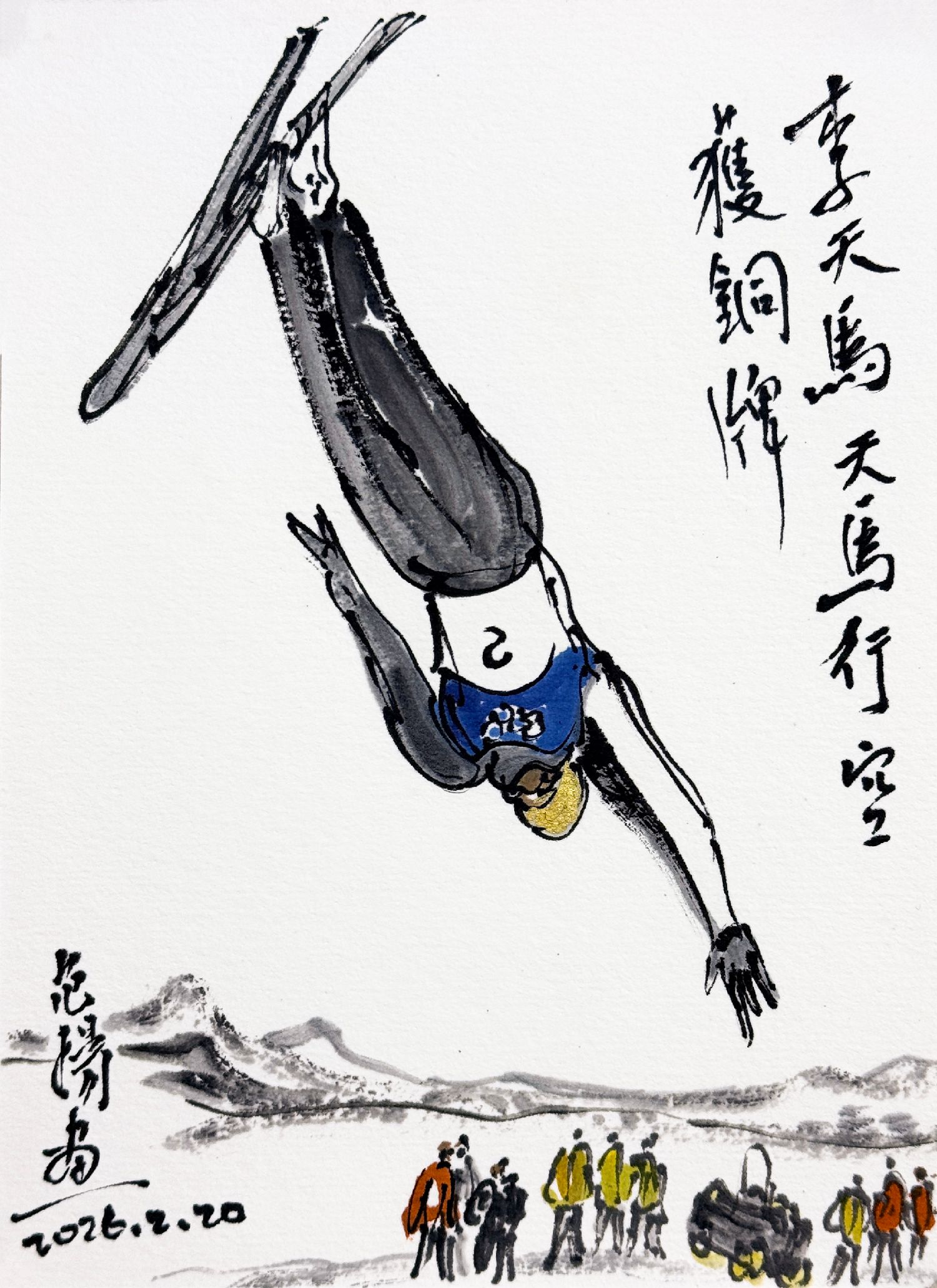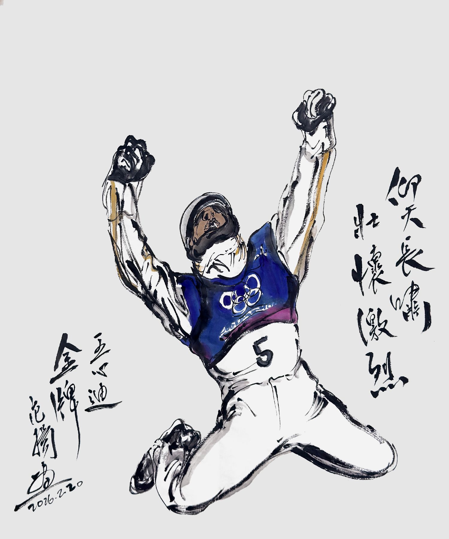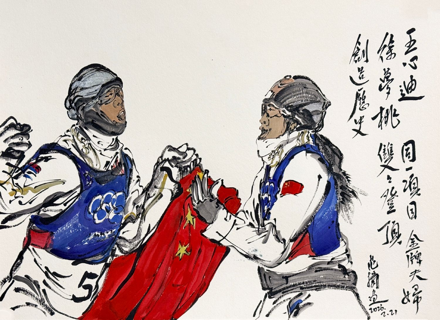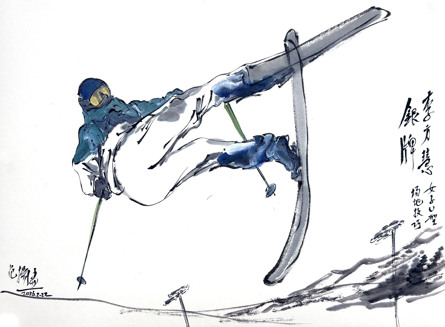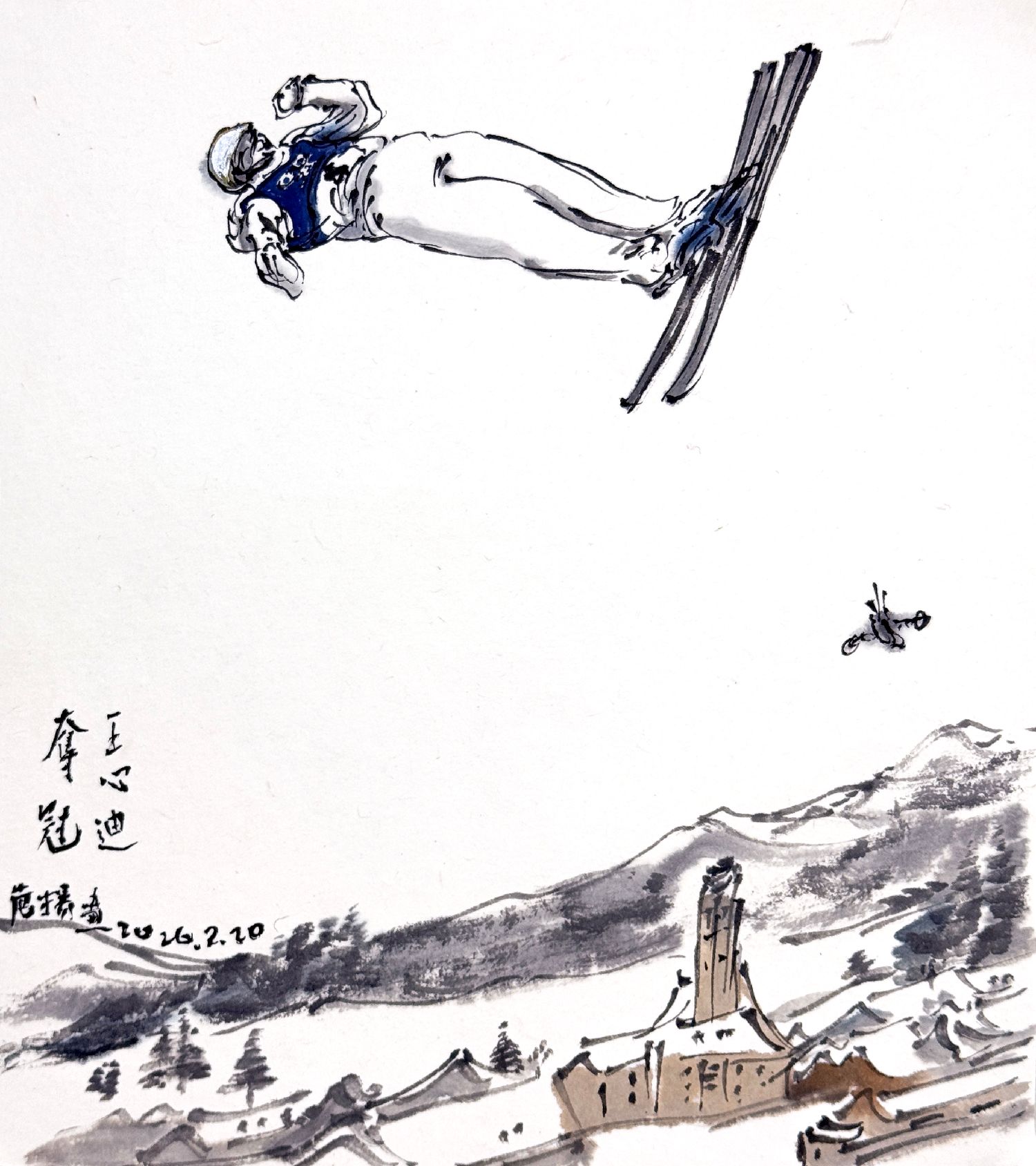 王心迪夺冠、谷爱凌夺冠!李方慧摘银、李天马赢铜!随着米兰冬奥会进入闭幕倒计时,中国健儿夺牌的脚步没有停歇。著名书画家范扬先生妙笔生花,将一个个精彩瞬间跃然纸上。无论是徐梦桃、王心迪冬奥冠军夫妇的欢呼庆贺,还是谷爱凌的凌空大旋转;无论是李方慧的空中飞旋,还是李天马的“天马行空”,无不栩栩如生、呼之欲出。