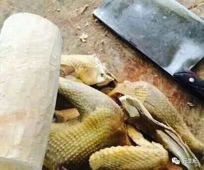 这里的棒棒鸡,选择当地的土鸡,煮好后一个人用刀切鸡肉,另一个人用棒棒敲击刀。