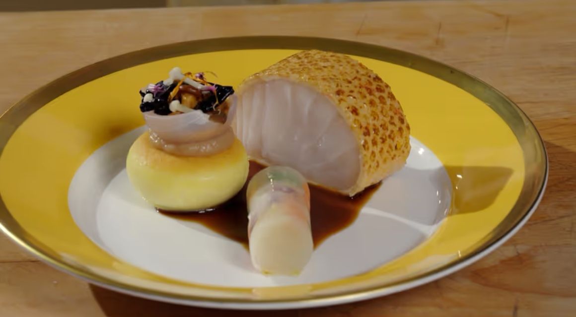 这道菜将鳕鱼和帝王蟹搭配在一起,营造出丰富的口感。鳕鱼肉质鲜嫩,帝王蟹肉质肥美,搭配在一起非常美味。还搭配了冬季蔬菜和夏季腌制时令蔬菜,以及烤蓝贻贝酱,可以增加菜肴的层次感。