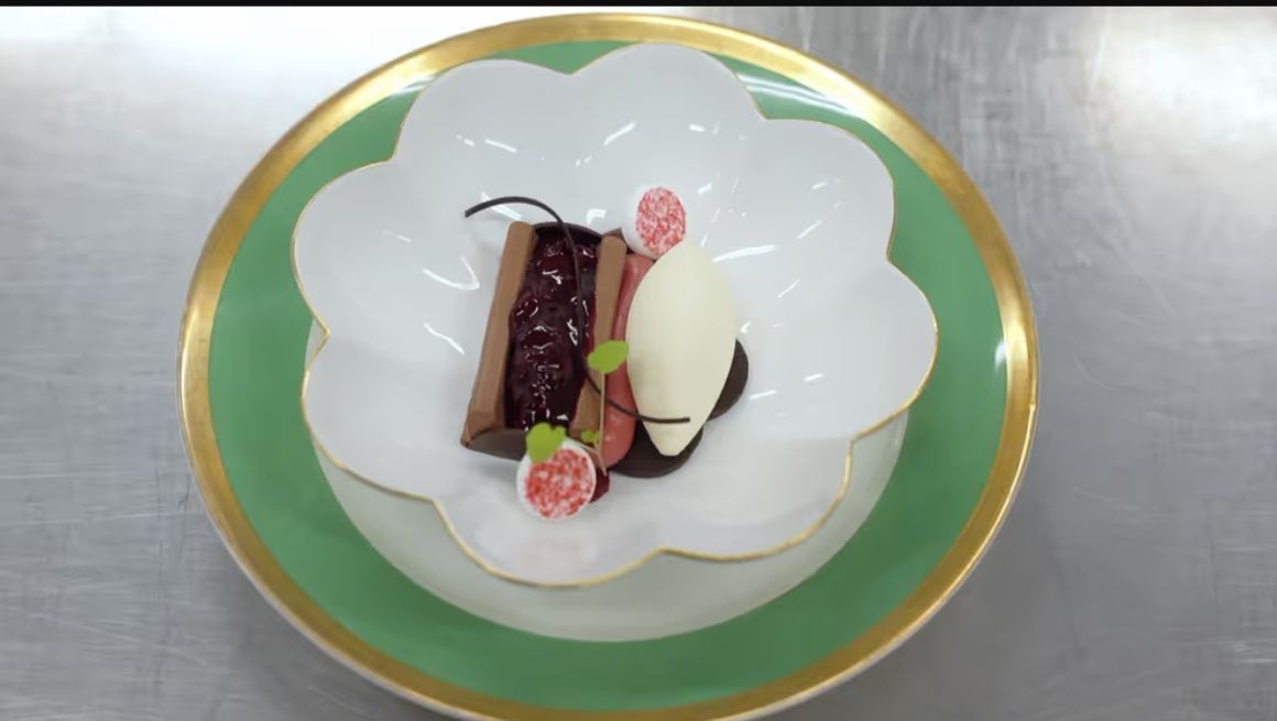 这道甜点使用了来自波登的越橘,为巧克力奶油增添了酸甜的滋味。搭配巧克力沙布列、越橘牛奶巧克力、马卡龙和越橘奶油,以及新鲜的奶油冻,可以让甜点更加丰富。