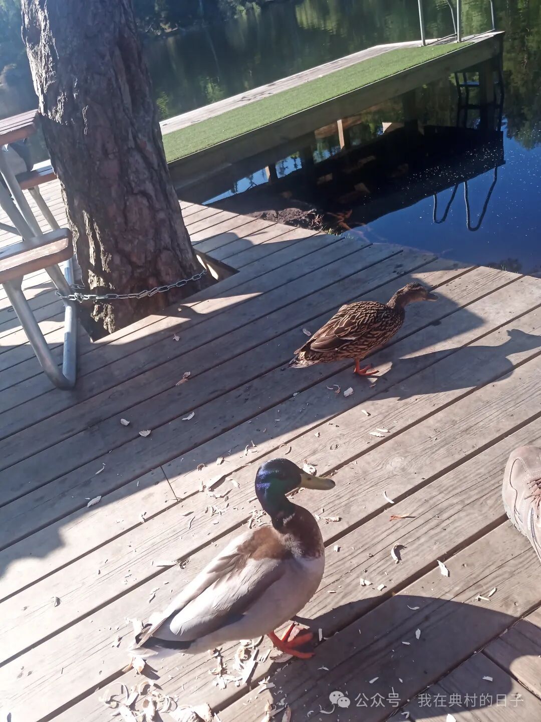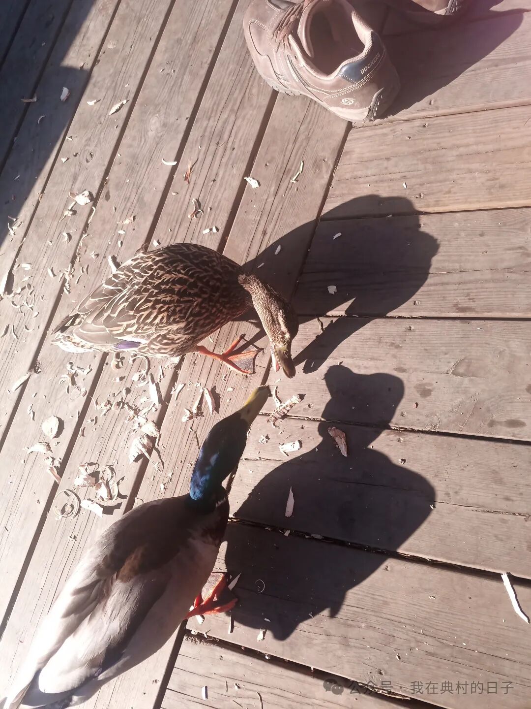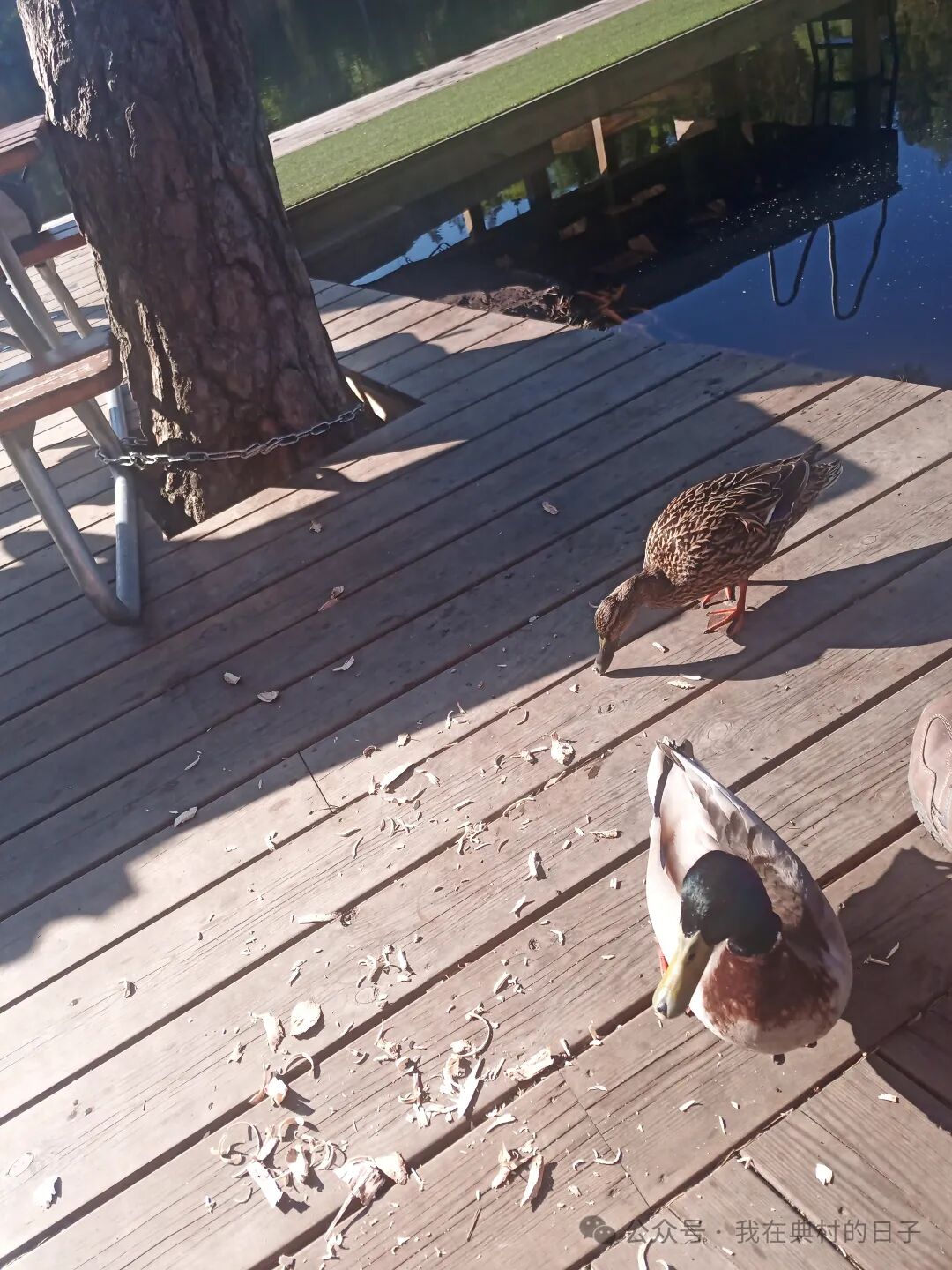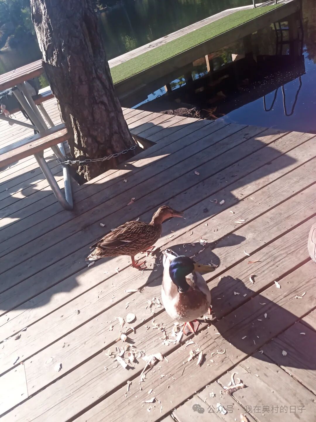 不知道是不是昨天见到的那只鸭子,还带了它女朋友过来了。两个小家伙就在我们坐着的长椅后面转悠,有时还在桌子底下穿来穿去。我把腿抬起来,怕它们啄我😅。