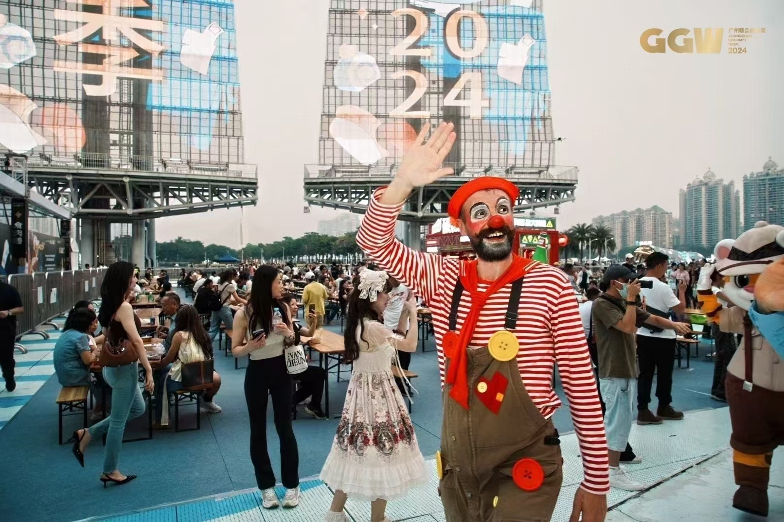 在广州精品美食周活动现场,来自长隆欢乐世界的表演队伍不时穿梭其间,为全场带来精彩的巡游表演。