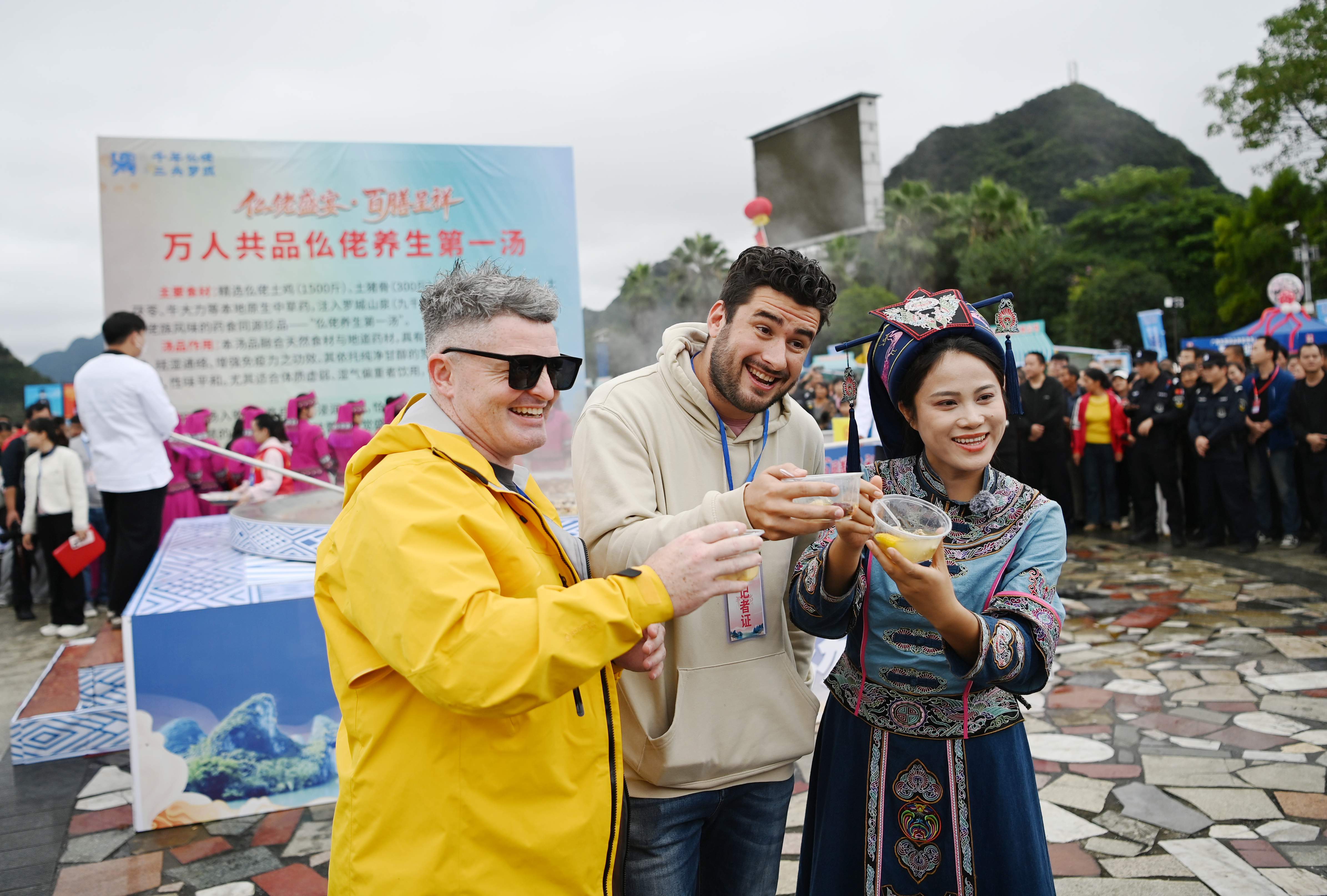 11月8日,外宾参加“仫佬盛宴・百膳呈祥”美食嘉年华仫佬养生汤起锅仪式并喝仫佬养生汤。蒙增师摄.