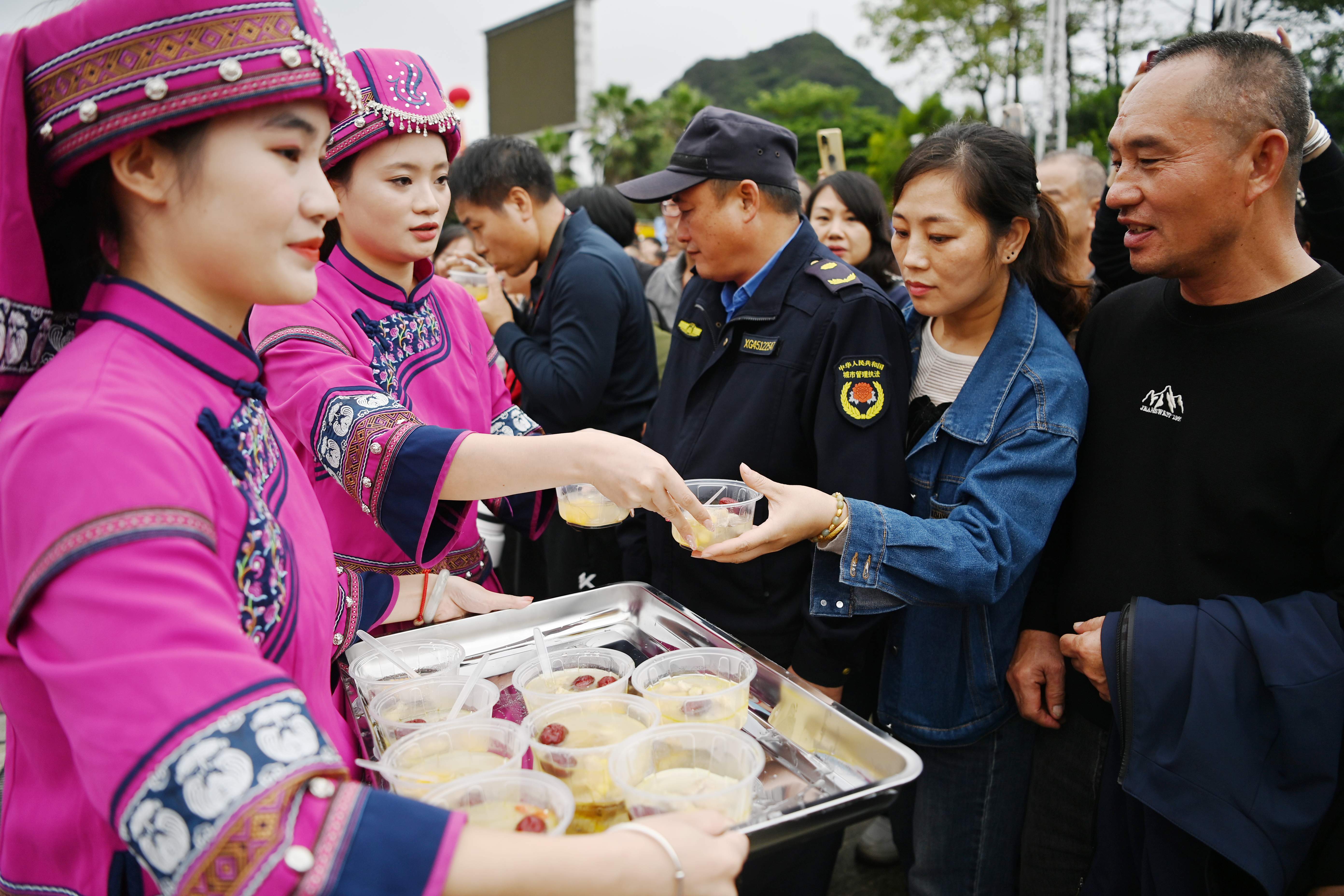 11月8日,志愿者给参加“仫佬盛宴・百膳呈祥”美食嘉年华仫佬养生汤起锅仪式的群众呈送仫佬养生汤。蒙增师摄.