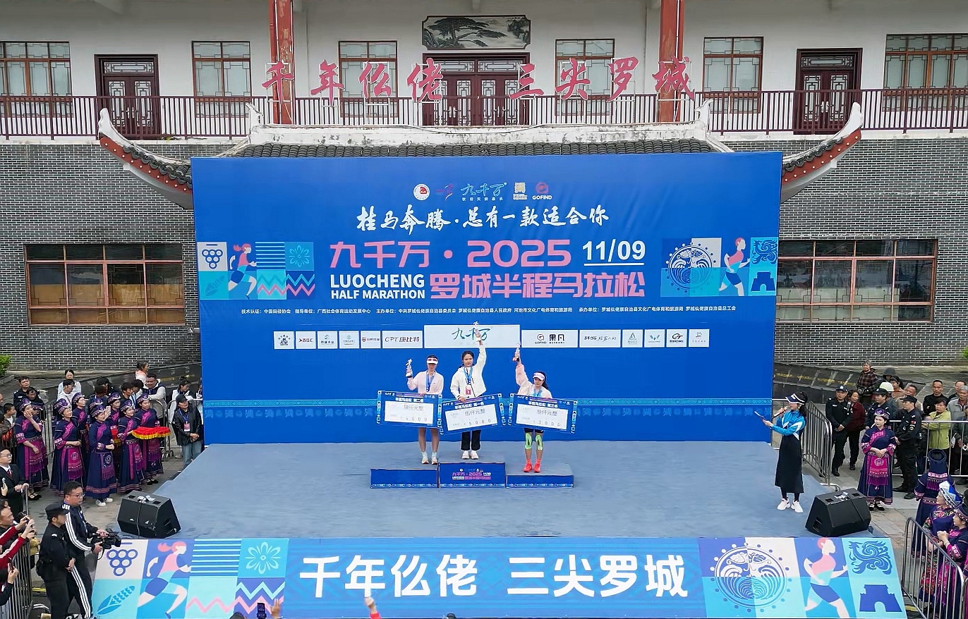 11月9日,九千万・2025罗城半程马拉松女子半程组前三名。覃义探摄