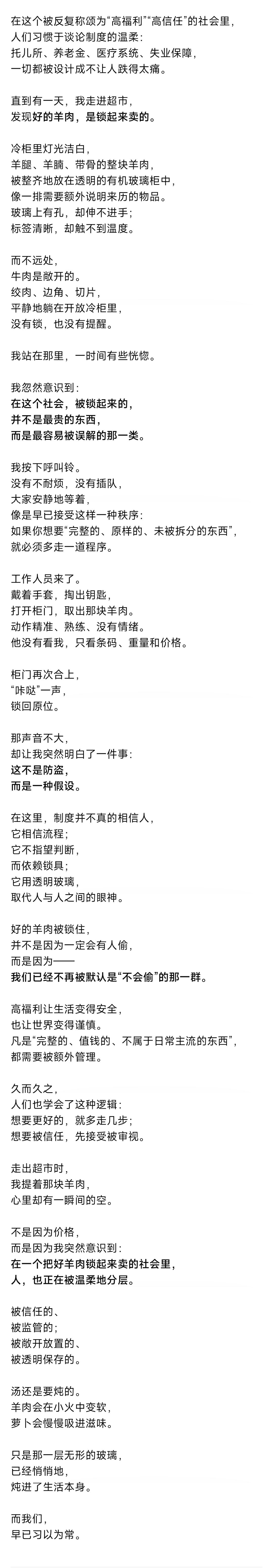 The system does not truly trust people;it trusts procedures.It replaces judgment with mechanisms,and eye contact with transparent barriers.