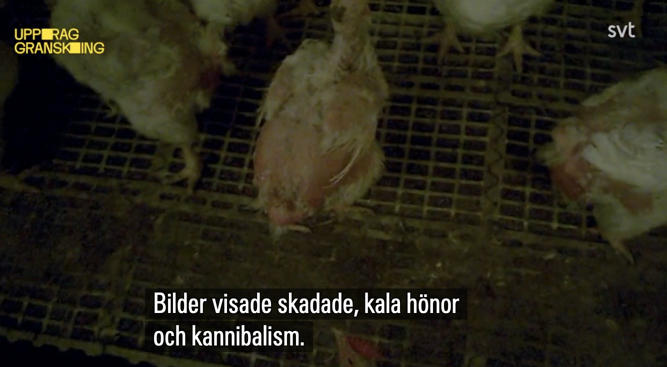 Bilderna från svenska avelsgårdar visar fjäderlösa,skadade hönor–och till och med kannibalism.Materialet kommer från anläggningar som tillhör avelsbolaget Aviagen,en central leverantör till den svenska kycklingindustrin.