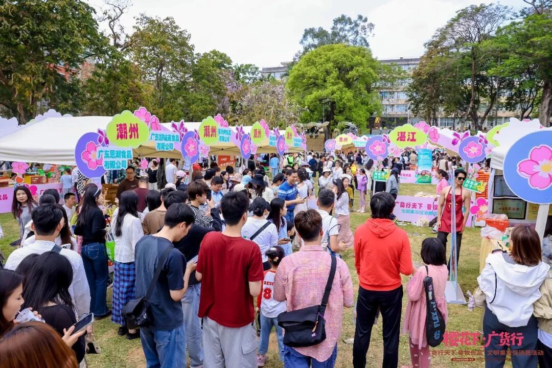近2000株樱花盛开,花雨落满林荫道,粉白交错的紫荆花瓣也落在一排排热闹的摊位之间,人群与花影交织在一起。牛肉丸翻滚出热气,土鸡、烤牛蛙肉、腊味香味四溢。