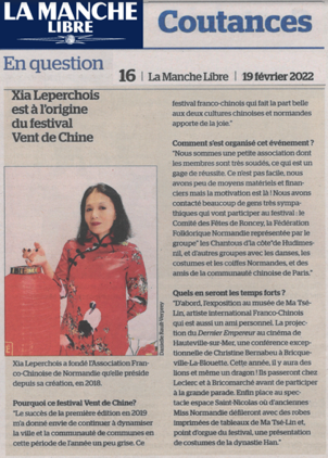 2022年2月19日的法国西部大报纸“La Manche Libre”刊登人物特写; « Xia LEPERCHOIS estàl’origine du festival VENT DE CHINE » 编译:Xia LEPERCHOIS是中国风文化节的发动和策划人