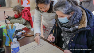 在文化中心的一边,有中国书法展示和入门练习,在来自中国辽宁沈阳的姗姗指导下,喜爱中国书法的法国友人仔细的听着,练着;
