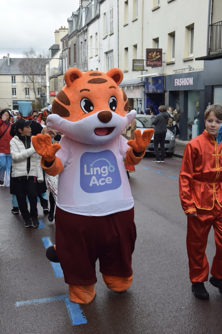 伴随着湿润的诺曼底雨水,彩妆游行队伍走走停停,完成了不同主要街道的表演,又回到了圣尼古拉教堂中心广场:此时的老天爷也似乎也被这股强劲的中国风所感动,突然蓝天白云,雨停了,虽然人们都脸上还透着雨水汗水,有舞狮舞龙队带头帅气地给在场热情的观众表扬了一整套狮子走道,送水果的节目,舞龙队也威武的表演一番,赢来一阵阵的喝彩声,把气氛一下就热烈起来: