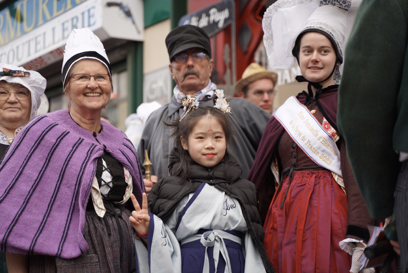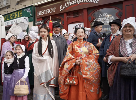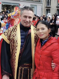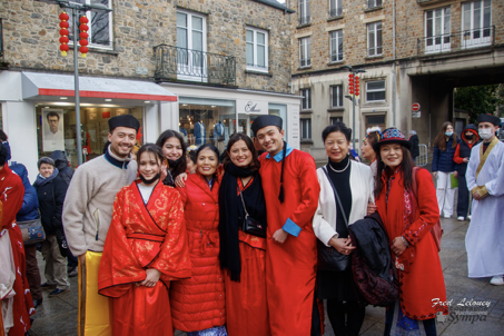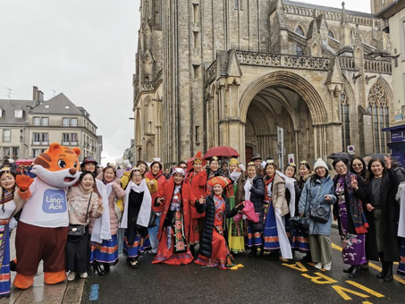男女老少身着中式传统服装和诺曼底当地民族服饰欢歌笑语,中法一家其乐融融,来自法国诺曼底大区周边城市上万民众赶来,欢聚到库唐斯市参观了彩妆游行队伍,达到史无前例,万人空巷的场面。