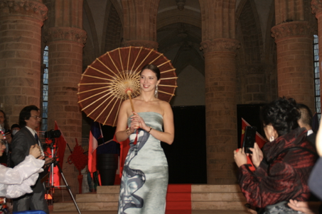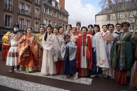 接下来的是朝气磅礴的由仲巾函会长带队的巴黎博博衍汉服协会的朋友们,他们穿着不同的汉服,手中拿着不同的精致的小道具,有折扇,有书笛和剑,华丽的服装,惊艳的姿态,吸引了众多诺曼底人的眼球,惊呼“太美了 ‘,其中有 2位穿着汉服的小朋友更是可爱!