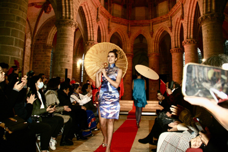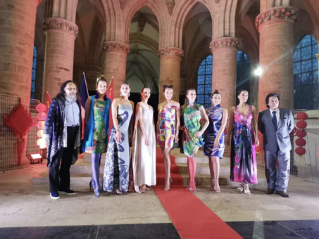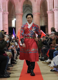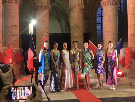 第一个出场的是特邀嘉宾:由7个美丽的诺曼底小姐组成的团队来展示马泽霖先生与中国现代时装设计师李微、屈汀南邱美恒联合创作的丝绸佛饰作品,出场的分别有
