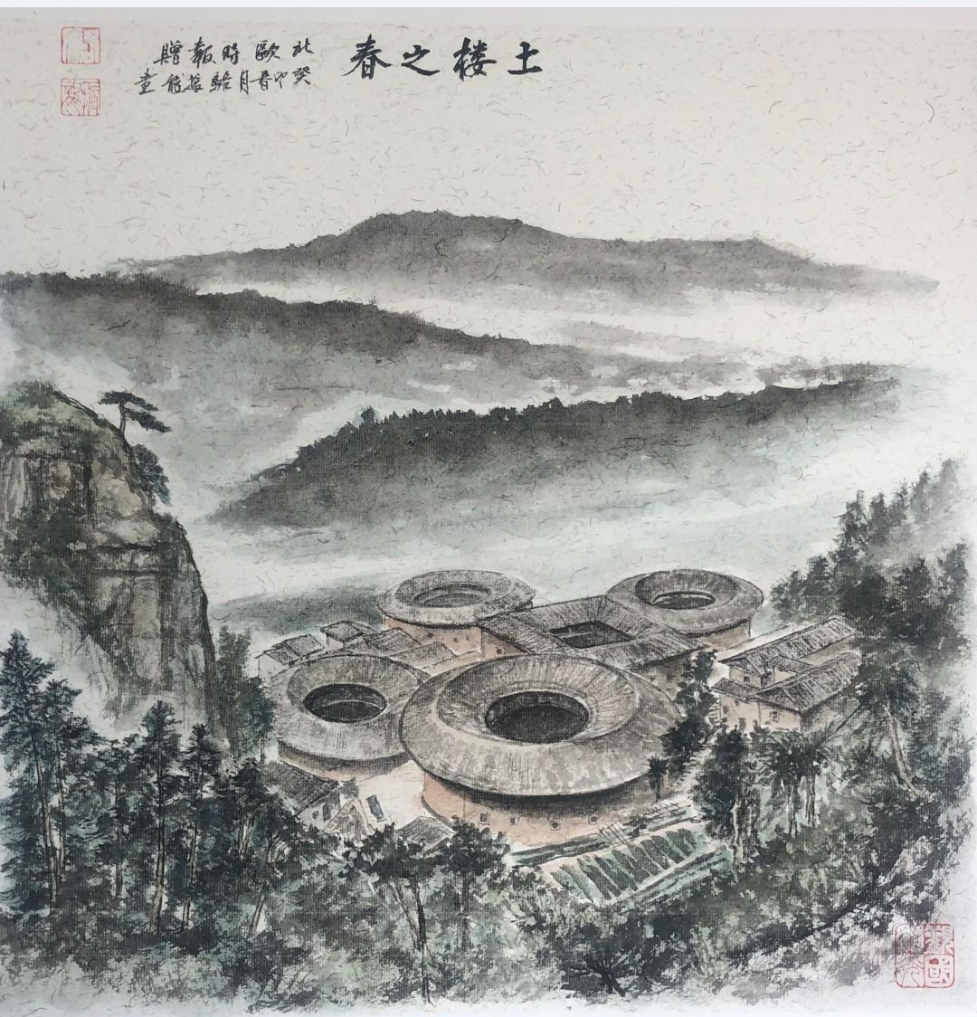 《北欧时报》副总编骆振龙还将提前创作的土楼美景图赠予中新社福建分社。
