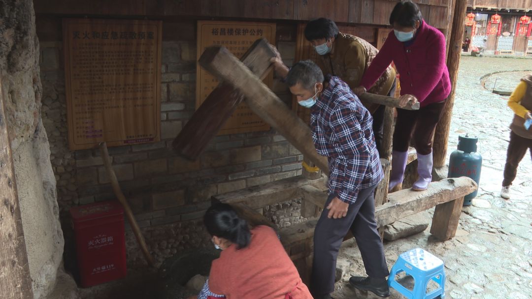 在裕昌楼,热情好客的土楼居民正在打糍粑,香甜软糯的糍粑让远道而来的客人们赞叹不已,而极具南靖特色的民俗表演,也让参访团的媒体人们纷纷拿出相机拍摄。