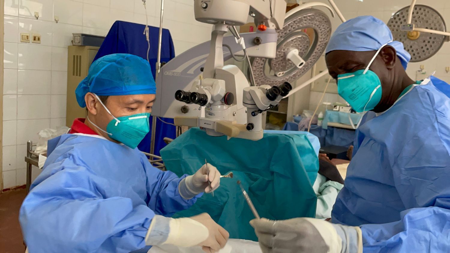 上周五,班吉友谊医院手术室,在成功独立完成了一台翼状胬肉切除术后,医疗助手Paul(保罗)得到了他的师父——第19批援中非中国医疗队眼科医生章友美的表扬。