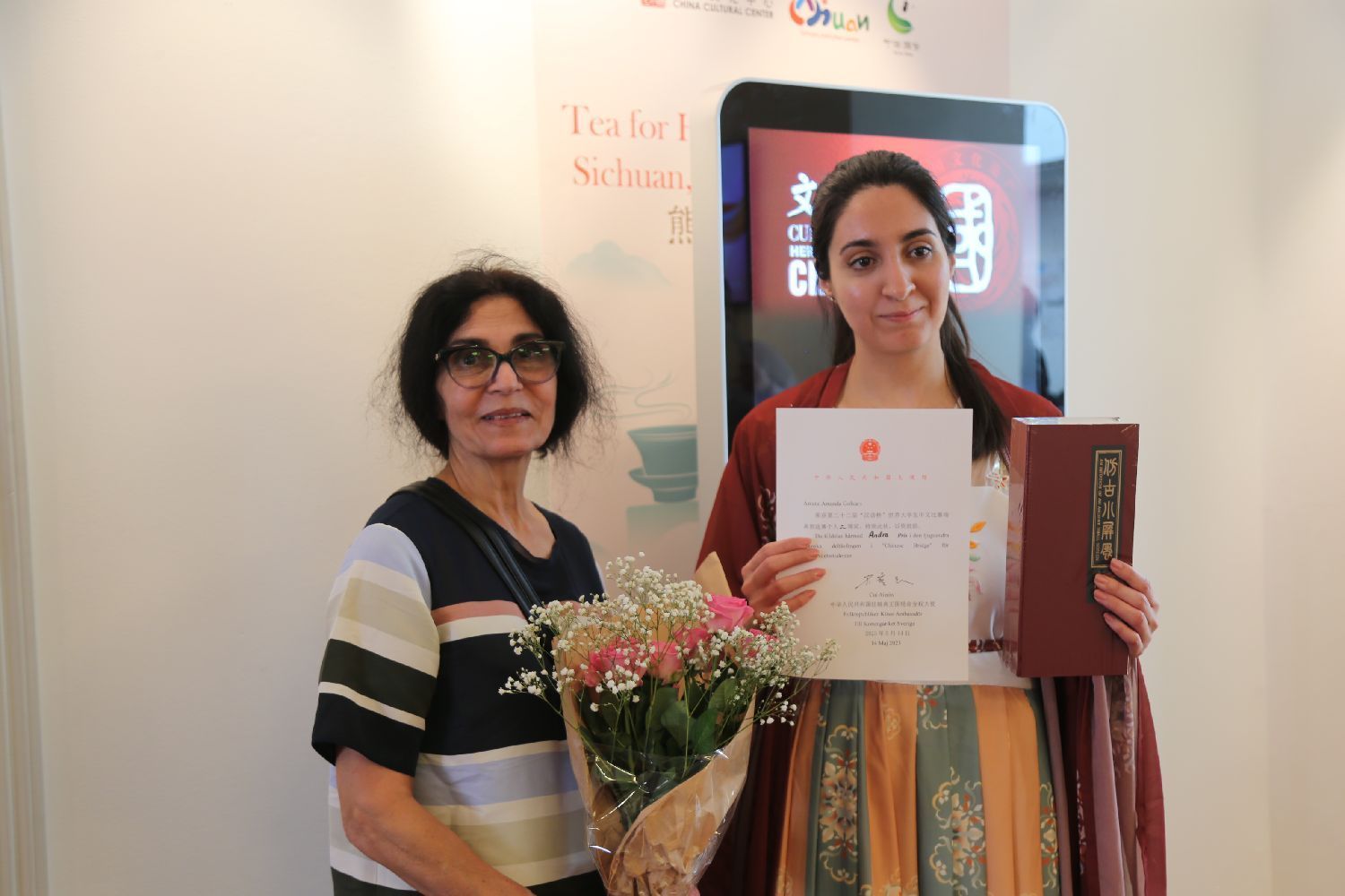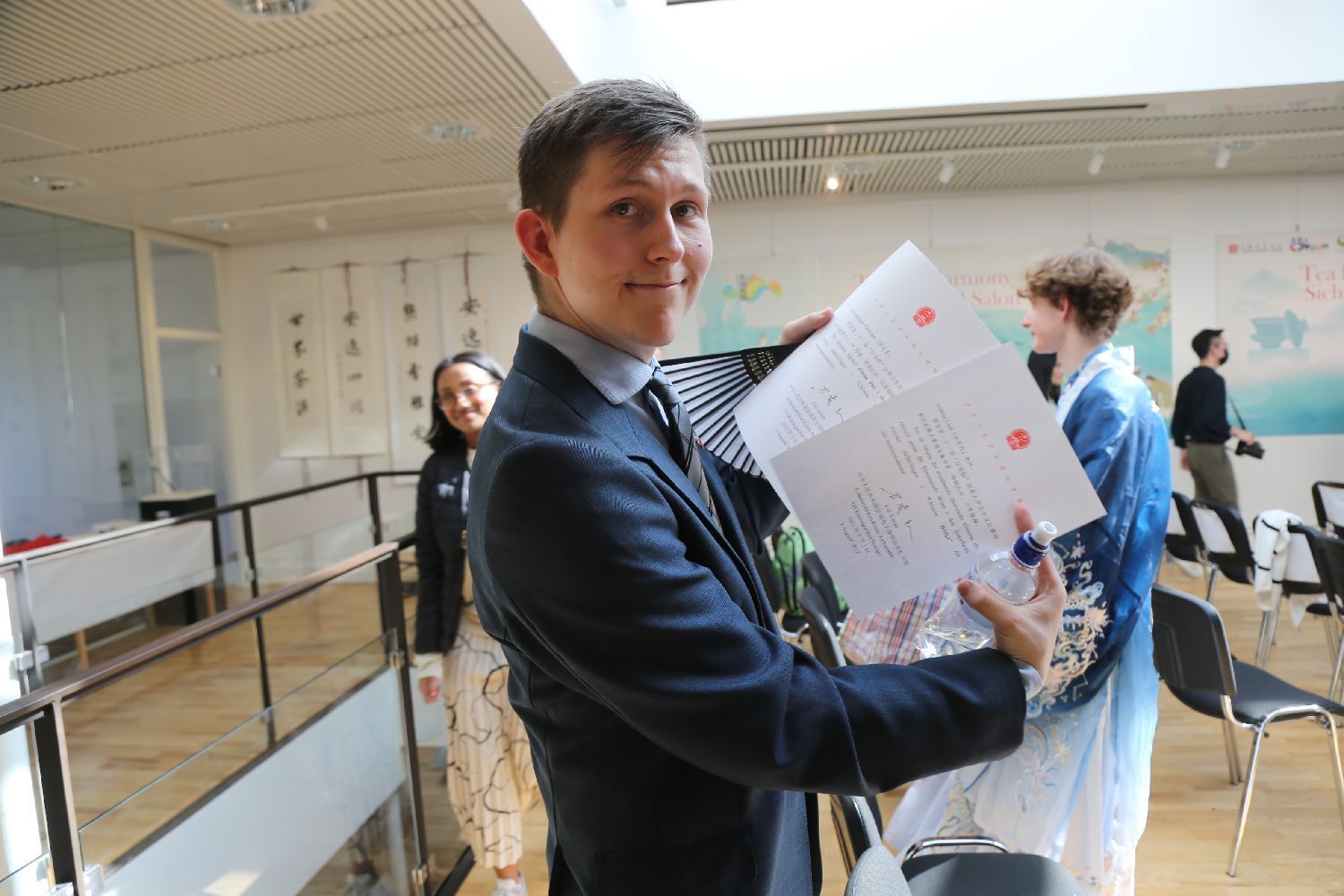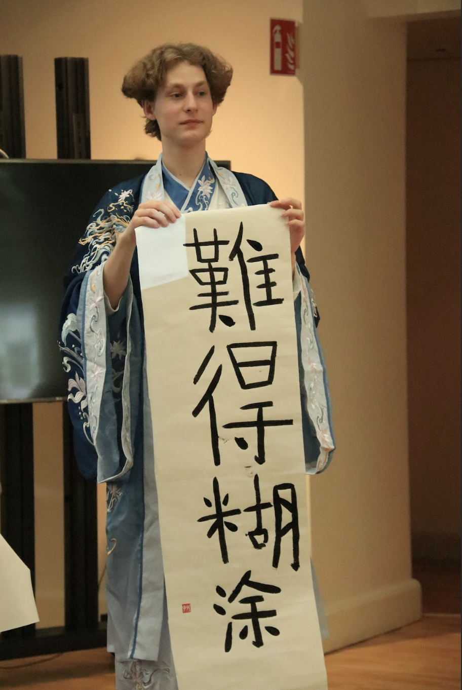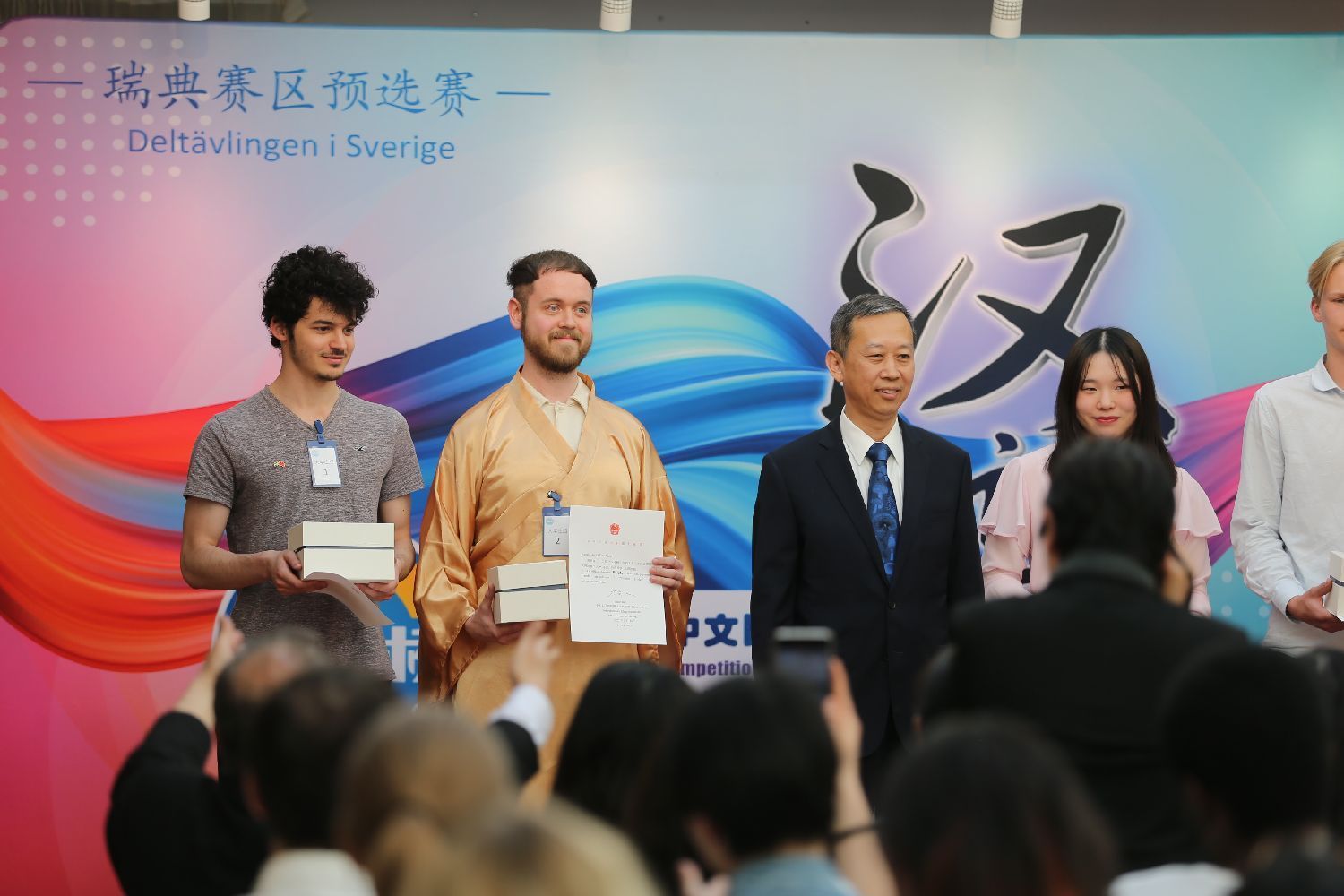 经过激烈角逐,来自瑞典Dalarna高校的Giacomo Tozzato(陈科摩)和来自斯德哥尔摩南拉丁高中的Folke Alexius Borgström(詹乐)分获大学生组和中学生组比赛第一名。他们将代表瑞典赛区参加2023年度“汉语桥”世界大学生、中学生中文比赛全球总决赛。特别值得一提是穿着翩翩汉服参赛的詹乐同学,中文演讲中他从多方面阐述了学习中文要尽早的道理,新意十足,才艺展示中他的书法作品颇有风骨,隐隐魏碑风范。