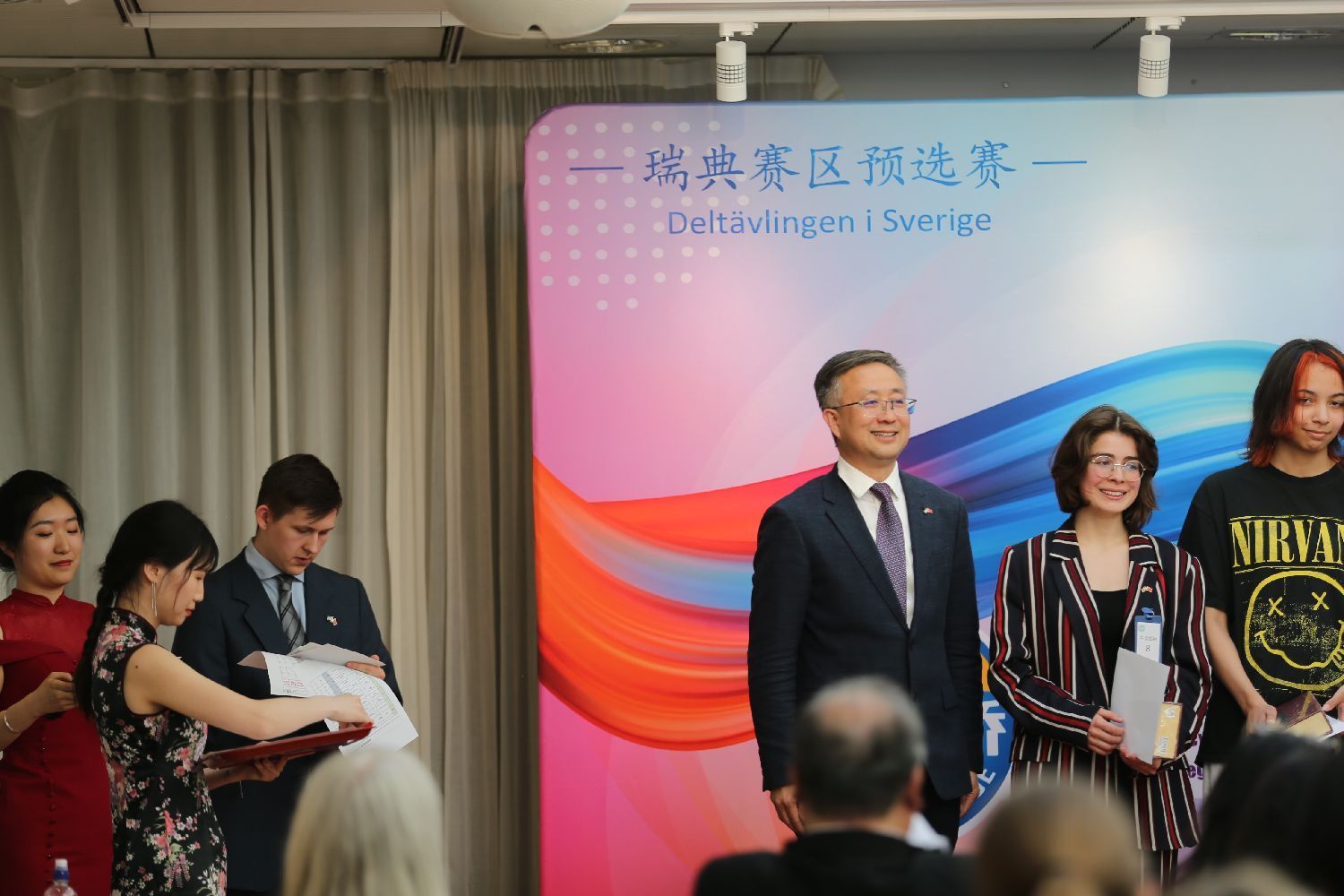 中华人民共和国驻瑞典王国特命全权大使崔爱民亲临比赛现场,为参赛选手加油并颁奖,崔爱民在致辞中表示,通过比赛这一堂特别的中文课,瑞典同学的中文佳绩得到了展示,中瑞两国的文化得到了交流互鉴。崔爱民分享了“天下一家”“和而不同”“殊途同归”三个汉语成语,讲述了中国文化的价值观,表达了两国人民对和平美好生活的向往,阐释了全球文明倡议的丰富内涵。