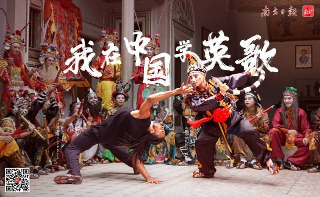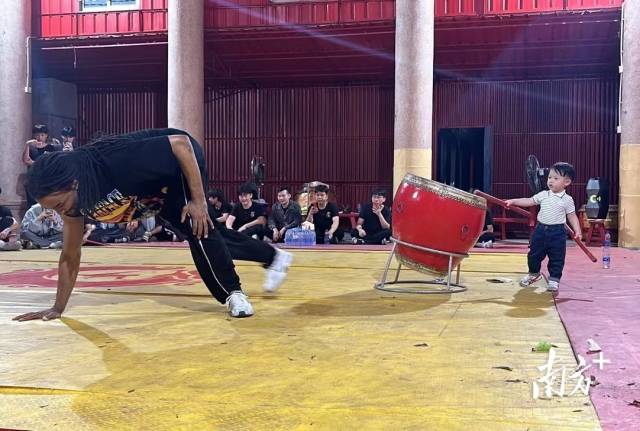 当晚,一个半露天的台子,围满了闻讯而来的观众。“英歌队里来了街舞队员,还是法国人,这是第一次见,新奇得很!”甚至有居民抱着小朋友前来“学艺”。