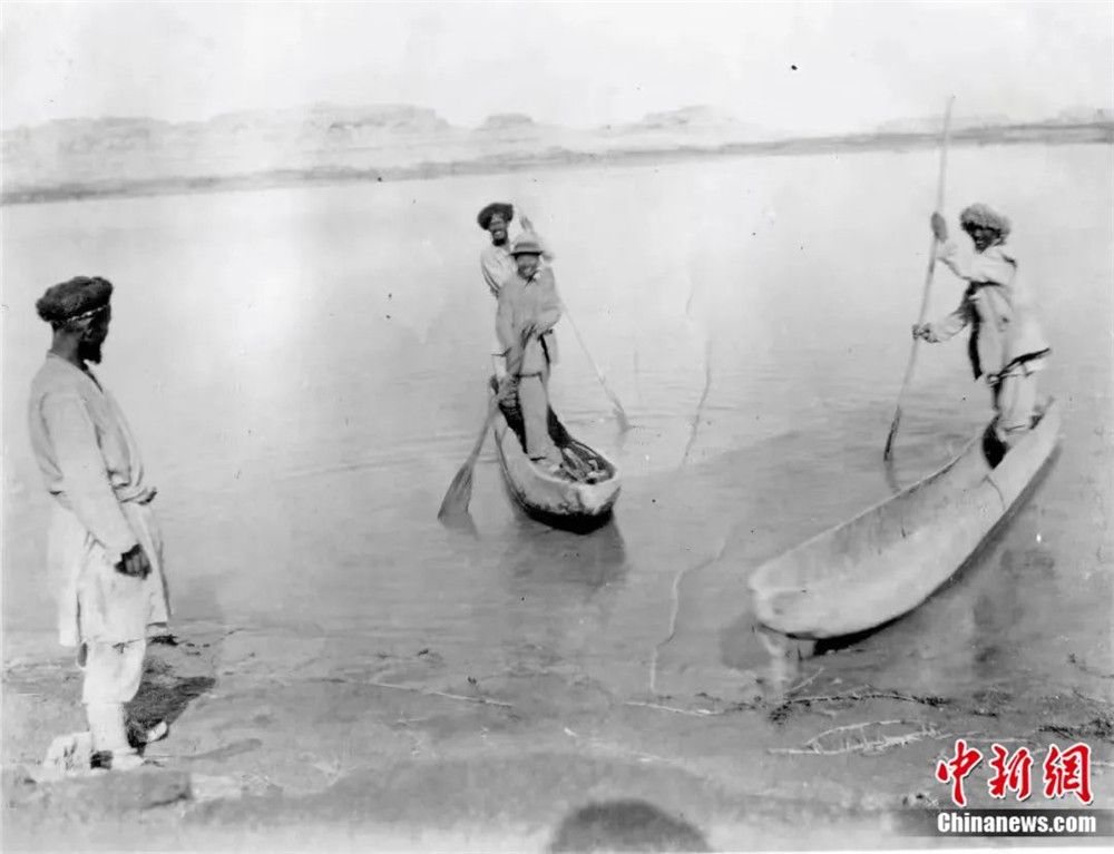 1928年,黄文弼(中前)在罗布泊划船。(图片来源:新疆师范大学黄文弼中心供中新网)