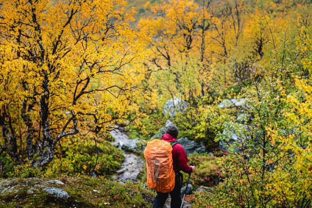 “国王之路”全程400多公里,穿越瑞典拉普兰地区四个国家公园,踏过深邃的桦木林,攀上瑞典最高峰凯布讷山,沿着奔腾的河流前行。