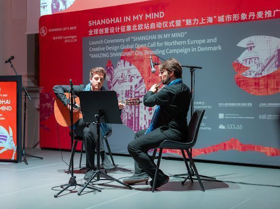 走进二楼大厅,红色灯饰妆点了会场。在中阮、长笛、古典吉他声中拉开了活动的序幕。主持活动的是一位丹麦年轻小伙子Toby Rasmussen。首先由哥本哈根文化中心郑文主任致欢迎辞,儒雅的郑主任充满感情地说道:“上海,这座位于东方的现代大都市,自诞生以来就一直扮演着中国文化和国际文明的交汇点。在这里,东西方的文化元素不是简单地共存,而是相互融合、相互渗透,形成了一种别具魅力的独特风貌。”他欢迎大家来到文化中心,感受上海的魅力。