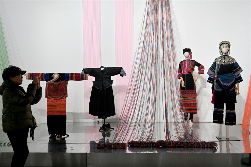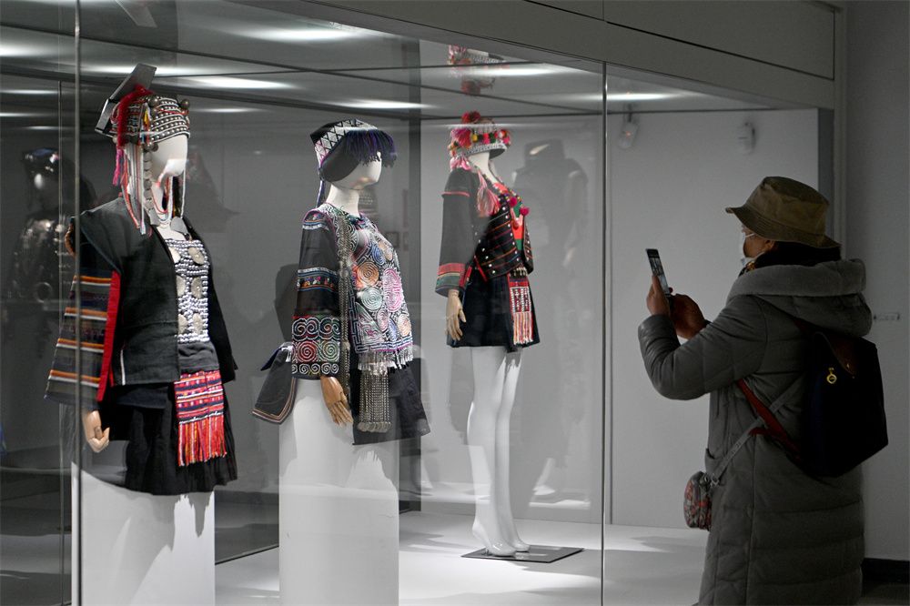 近日,展览中的哈尼族支系爱尼人婚礼装吸引参观者。
