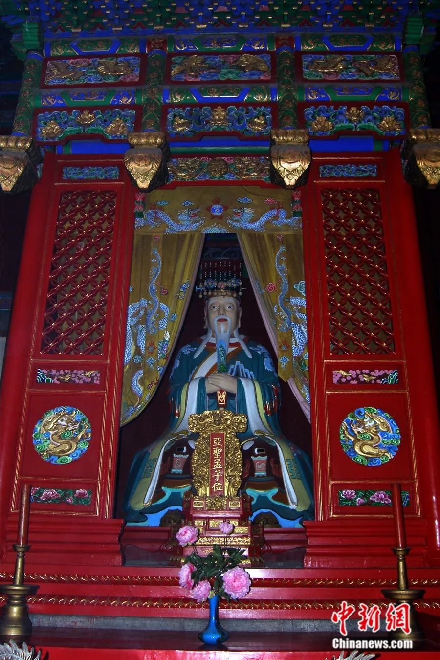 孟庙又称亚圣庙,位于山东省邹城市,为历代祭祀孟子之所。图为庙内的亚圣孟子塑像。(图片来源:中新网)