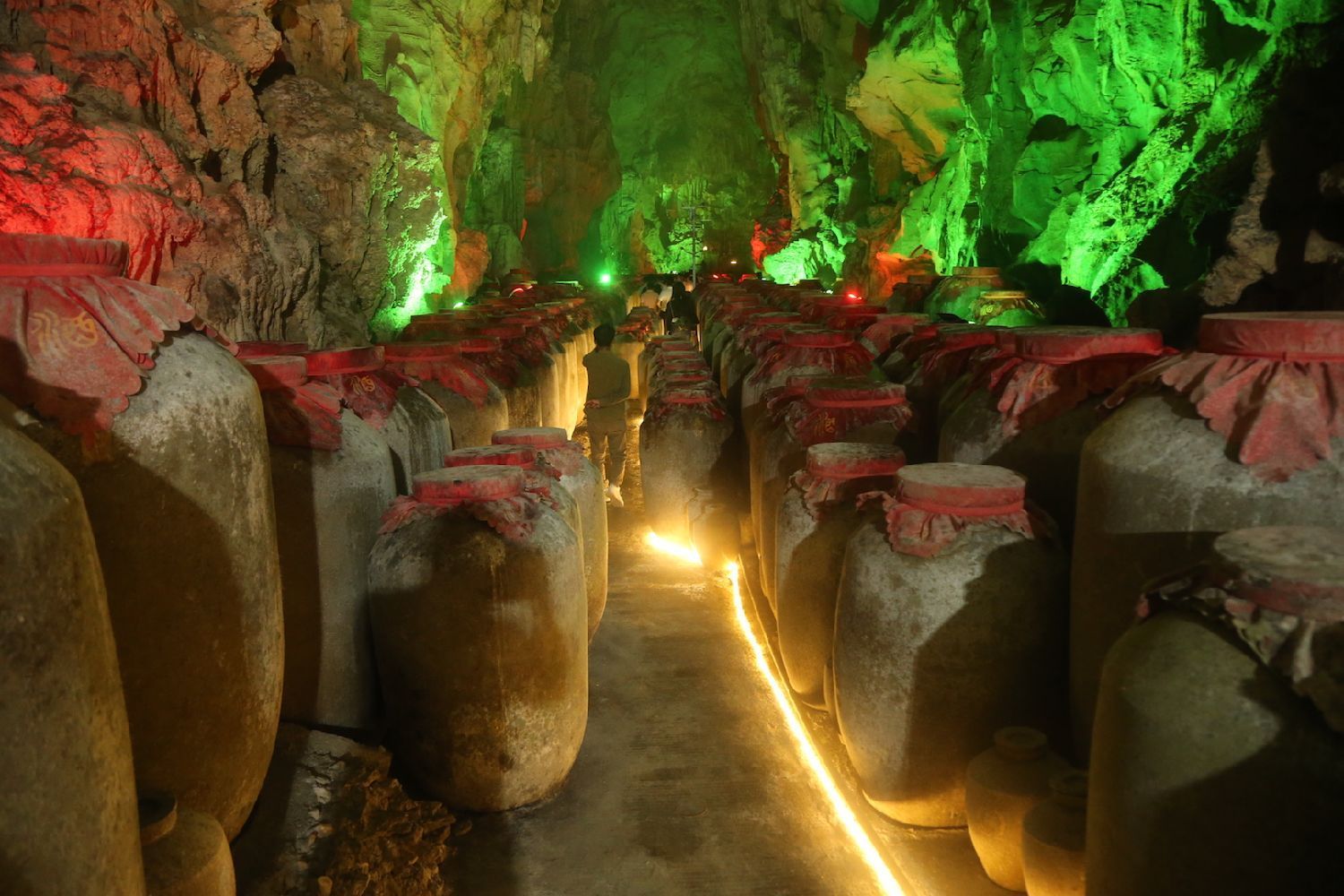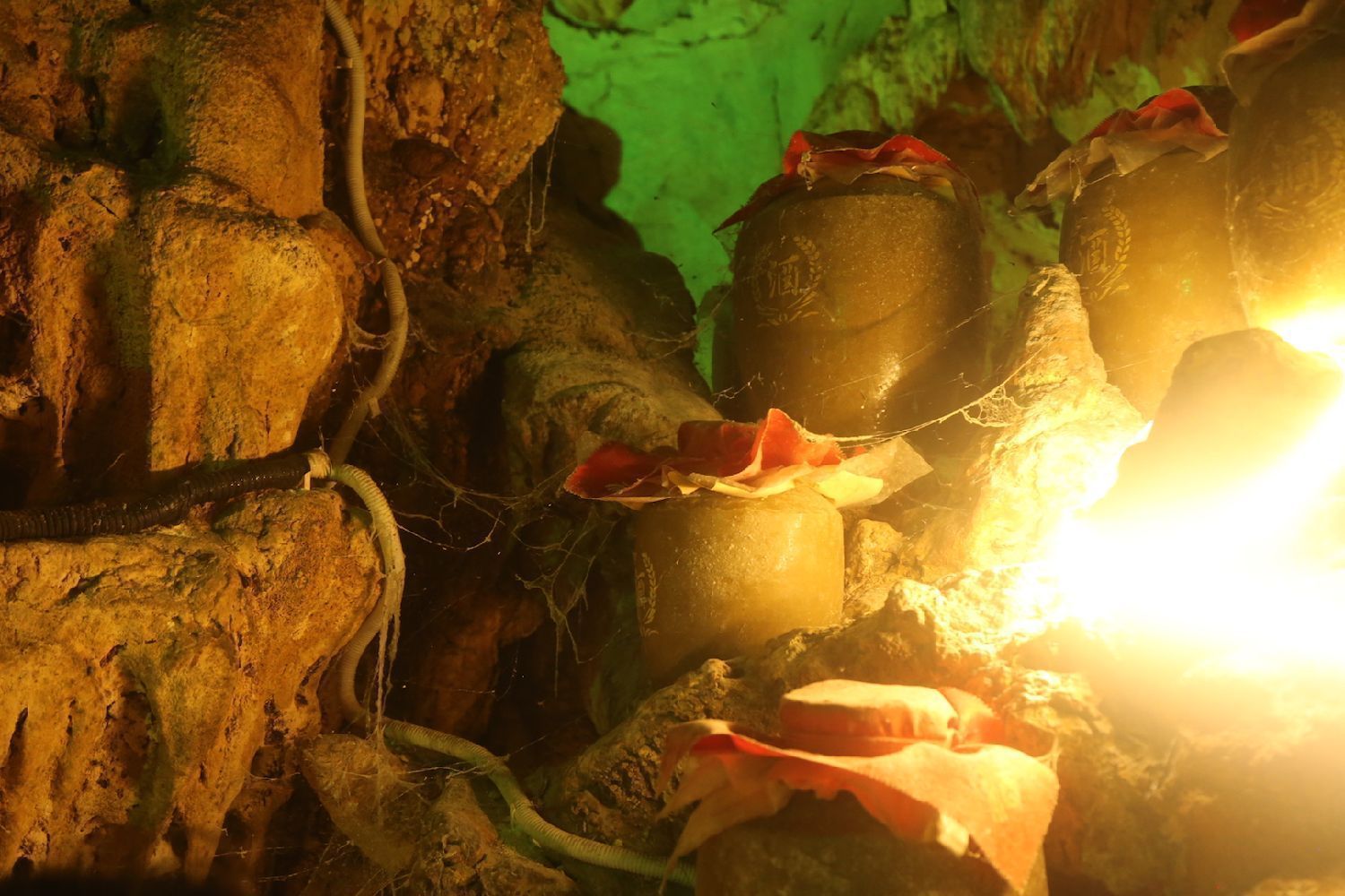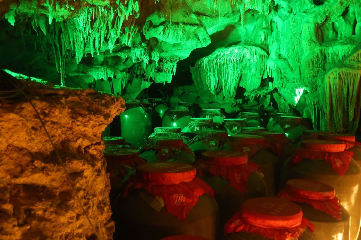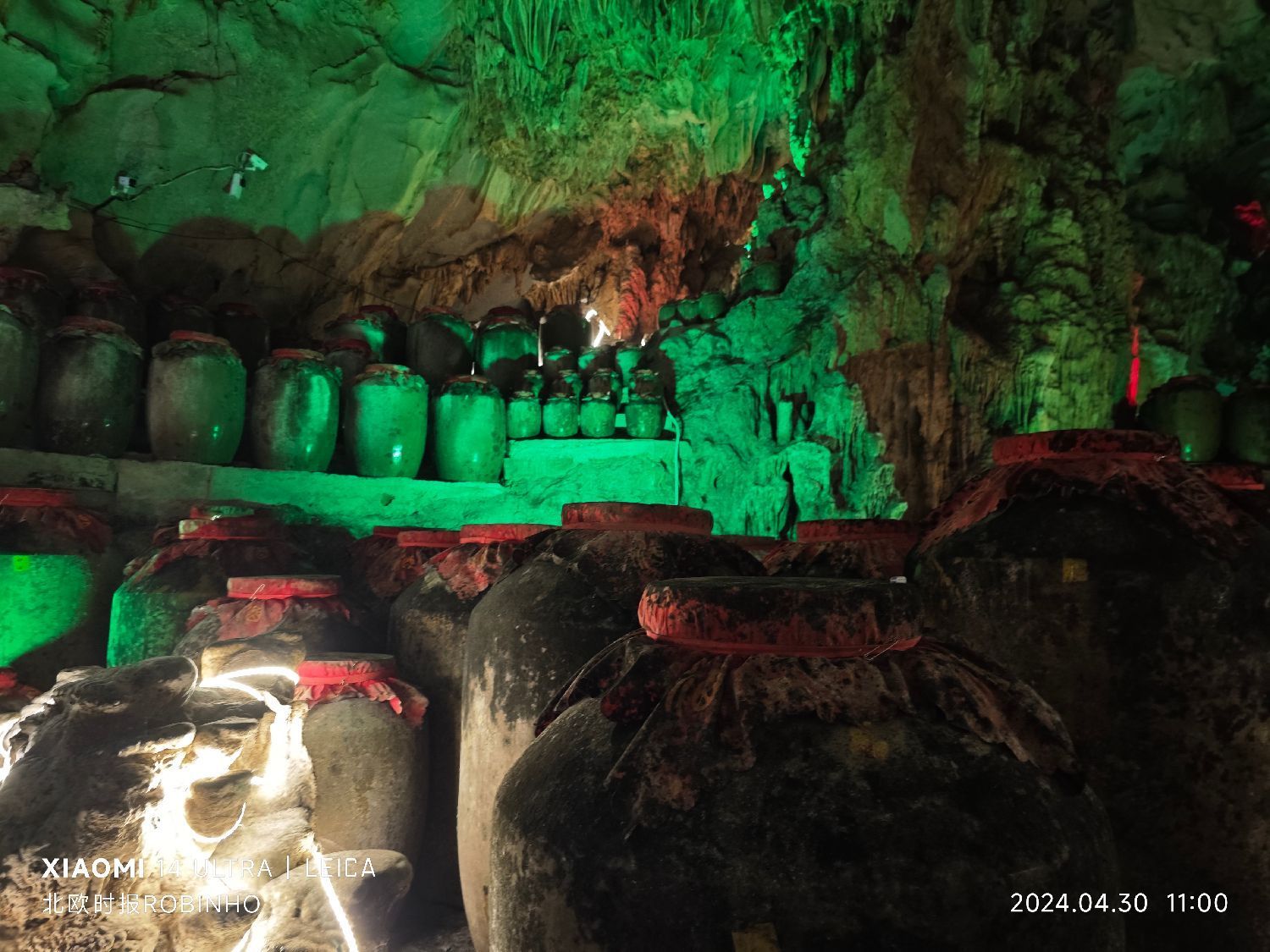 一走进门,一尊尊千百斤的酒坛像卫士一样整整齐齐的恭候大家光临。走进十来米略小的山洞口,立马被奇大无比的宫殿般的山洞吸引住了,抬头看,是各种奇形怪异的钟乳石,借着霓虹灯映射千百个酒坛,在好几个蓝球馆一样大的山洞里,你会被“不知天上宫阙,只是在人间”的梦幻酒国倾倒。你甚至误以为这里是不是海盗时代阿里巴巴藏宝的地方,如此巨大的藏酒洞,我敢说这是世界一绝,非天下藏酒洞不能比尔。我数不清有多少酒坛,大的可以装2000斤,小的几百斤或几斤的小酒瓶都有,都是经过山下精酿的纯粮食酒通过数字化管道输送进酒坛的。藏酒洞用现代科技手段监控酒质酒花,继续发酵过程。酒庄负责人说这些酒有的已经藏了十多年,短的也有几年,都是循环往复逐年累月封藏,根据市场需要而开启销往各地。