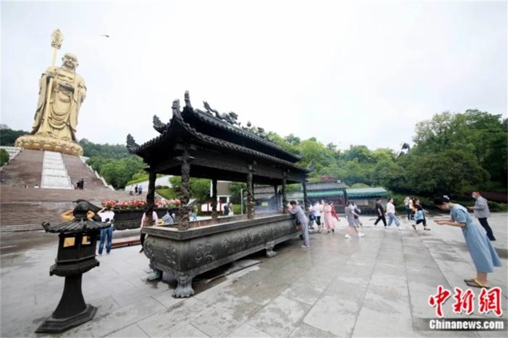 游客在安徽池州九华山大愿文化园里参拜99米高地藏菩萨像。